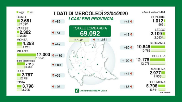 E’ sempre Milano la provincia con il maggior numero di contagi (17mila) e sempre con una crescita importante (+480). A crescere maggiormente tra ieri e oggi, mercoledì 22 aprile, sono state Brescia (+100, totale 12.078), Pavia (+93, totale 3.798) e Como (+89, totale 2.681). Continuano invece a dimunire i ricoverati in Regione (-113 per un totale di 9.692 pazienti) e quelli in terapia intensiva (-34, totale 817), mentre i dimessi pareggiano, come variazione nelle ultime 24 ore, i positivi: sono infatti 1.147 in più (42.820). Aumentano ancora, però anche i decessi (+161): sono state infatti 12.740 le vittime del coronavirus.