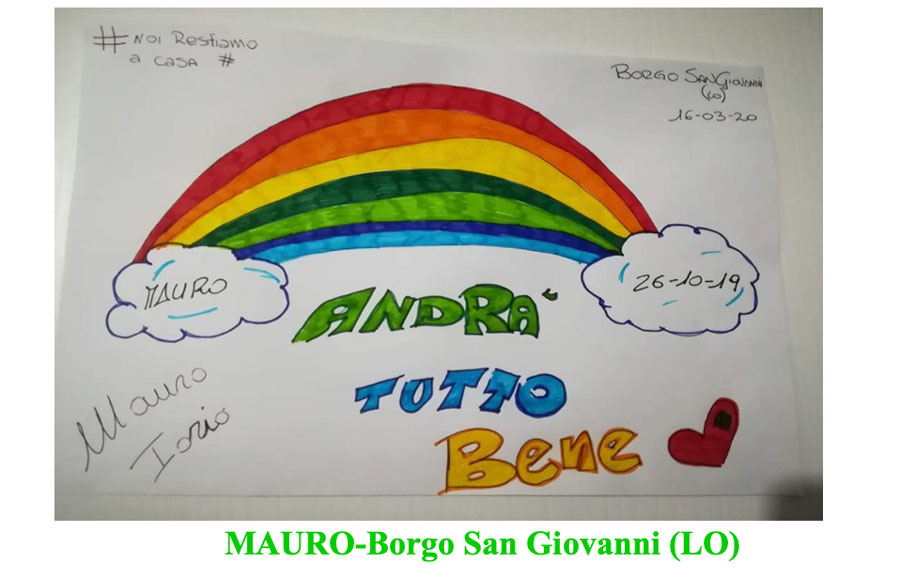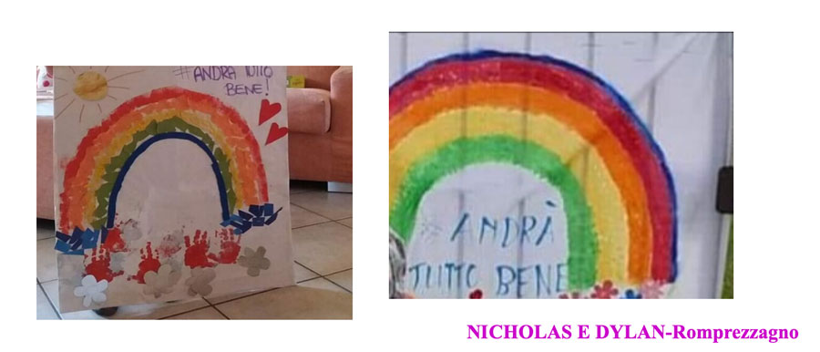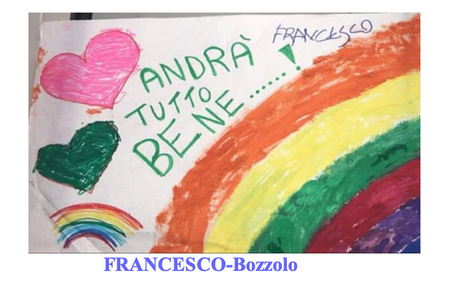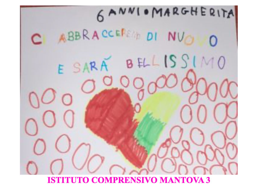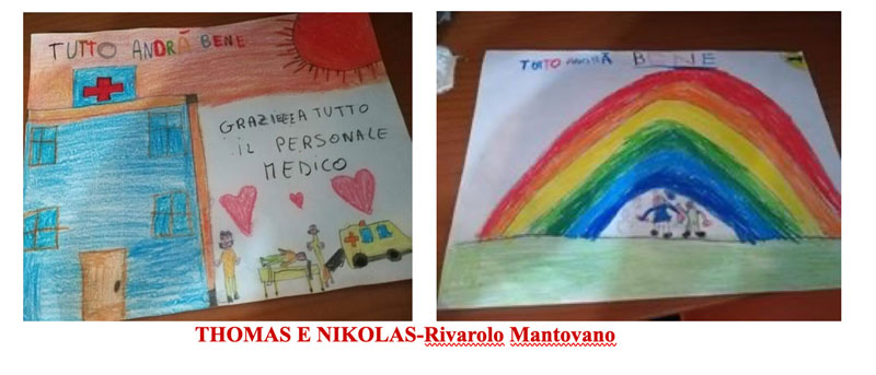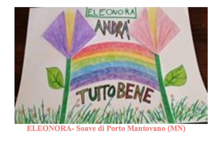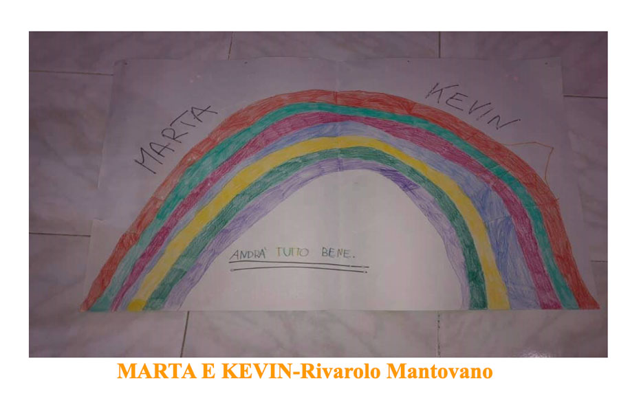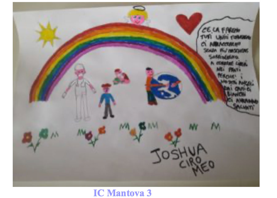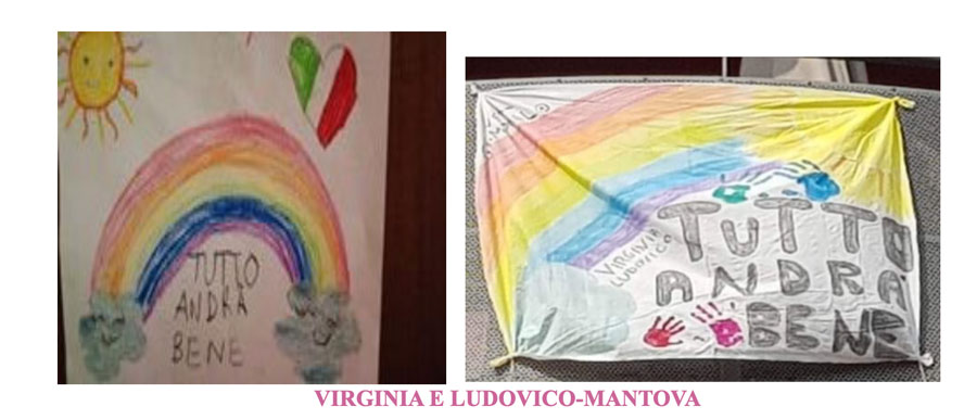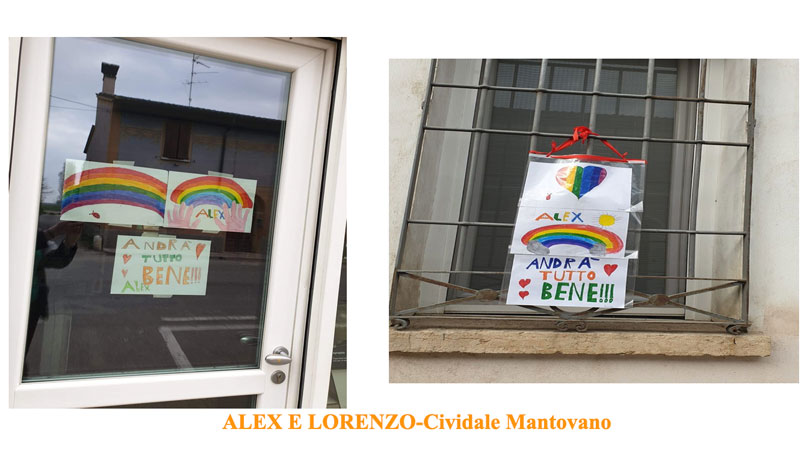 “Cartelloni che sono apparsi – spiega Benedetta – sul balcone del Municipio di Bozzolo, il mio paese (il cui ospedale intitolato a Don Primo Mazzolari si è riconvertito per ospitare malati Covid 19) ed affissi ai serramenti delle abitazioni e alle vetrine di molti paesi del territorio. Alla richiesta di mostrare sulla mia pagina Facebook i lavori realizzati dai bambini durante questo periodo di isolamento, la risposta è stata ampia e non circoscritta al solo territorio mantovano o cremonese. Da qui l’idea di raccoglierli e pubblicarli insieme per dimostrare la grande forza comunicativa di queste immagini: troverete gli arcobaleni di Alex e Lorenzo, disegnati per la finestra di casa e per il negozio da parrucchiera di mamma Elisa; quello della dolcissima Viola che lo ha attaccato sulla sua casetta dei giochi come a voler dirci “state a casa che siete al sicuro!” felice di avere vicini entrambi i genitori scrive mamma Monica per farsi coccolare e invente insieme nuovi giochi. Emily lo ha realizzato con tante manine colorate insieme a mamma e papà mentre quello di Nicholas è un tenerissimo collage di carta colorata, fiori e manine. Nonna Barbara mi ha mandato il disegno del suo nipotino Dante che vive a Brescia e rappresenta il “Signor Corona virus” come un sovrano comprendendone la potenza dirompente. Michele e Matilde hanno inserito vicino al loro arcobaleno la bandiera italiana per incoraggiarci e dirci che il nostro Paese ce la farà! Mamma Rita mi racconta che il suo Thomas ha voluto ringraziare chi lavora in ospedale e aiuta le persone a stare meglio, il fratello Nikolas ha disegnato un bambino con la mascherina rispettoso delle regole in contrapposizione ad un altro che non la indossa uscendo di casa, definendolo “furbetto”. Altri lavori di forte impatto emotivo sono stati realizzati dai bambini di diverse età dell’Istituto Comprensivo di Mantova 3. Ringrazio Daniela Cancellieri, l’insegnante che me li ha segnalati e fatti scoprire. Non vado oltre perché saranno le immagini a parlare e farci emozionare. Bambini diversi con la stessa voglia di raccontare in modo semplice la complessità della vita, con la loro creatività ci trasmettono grande coraggio rendendoli speciali… messaggi che mi hanno commosso e che ho scelto di condividere con voi tutti. Ed è pensando a loro e ai loro arcobaleni che ho scritto queste poche righe”.
