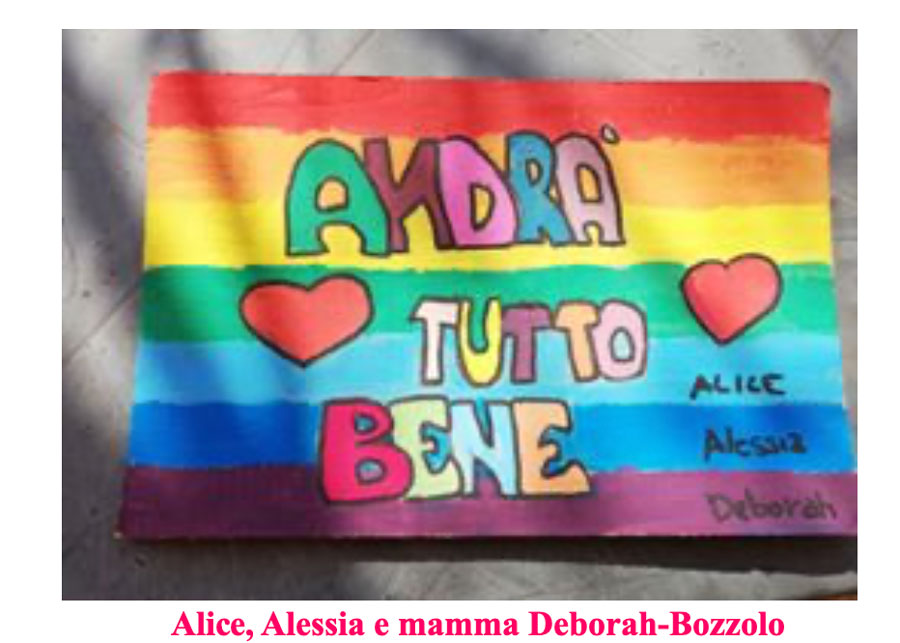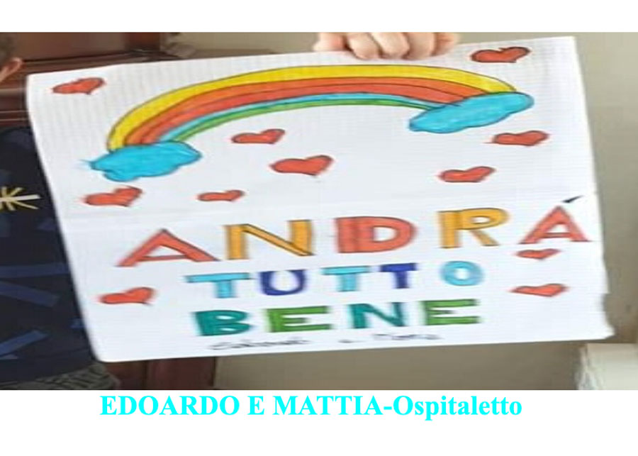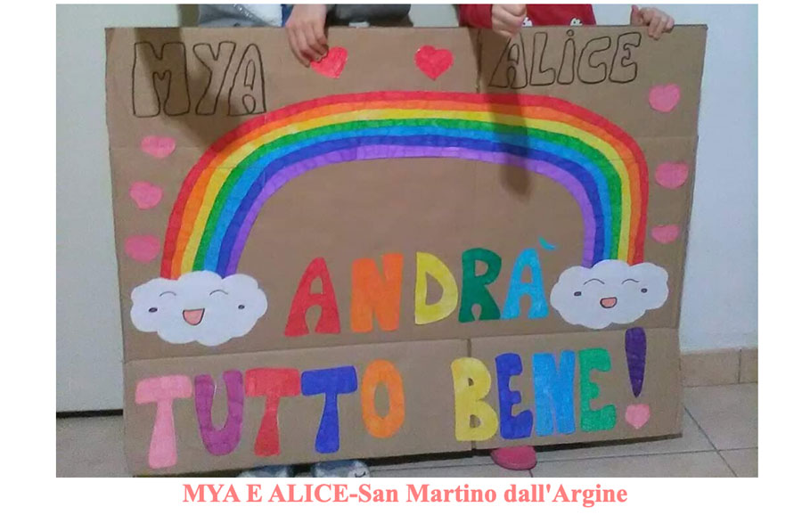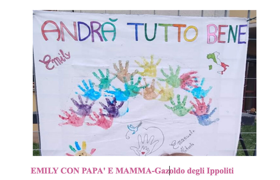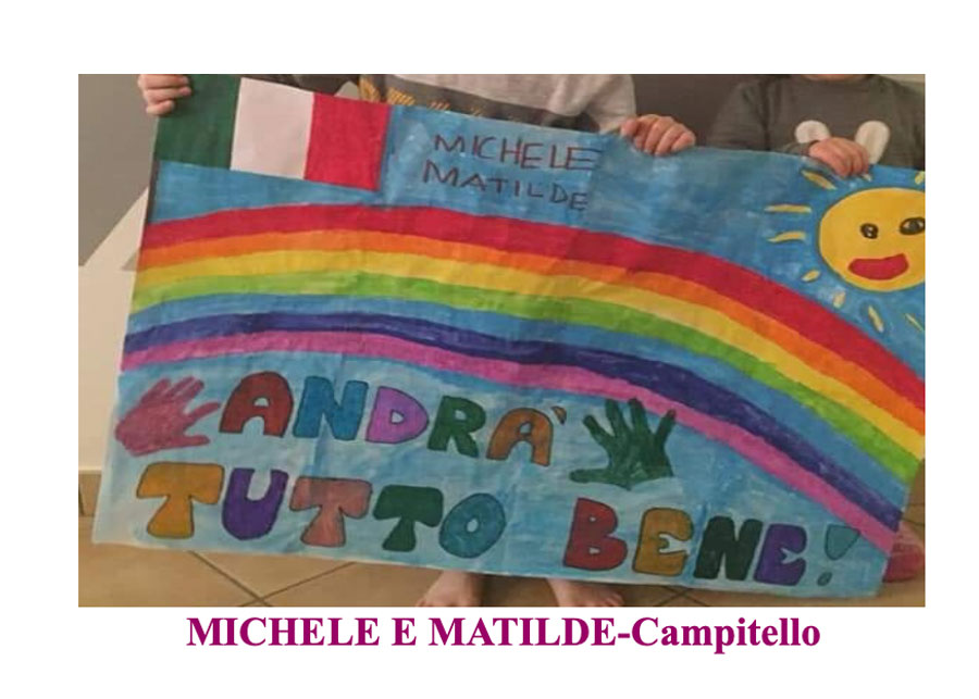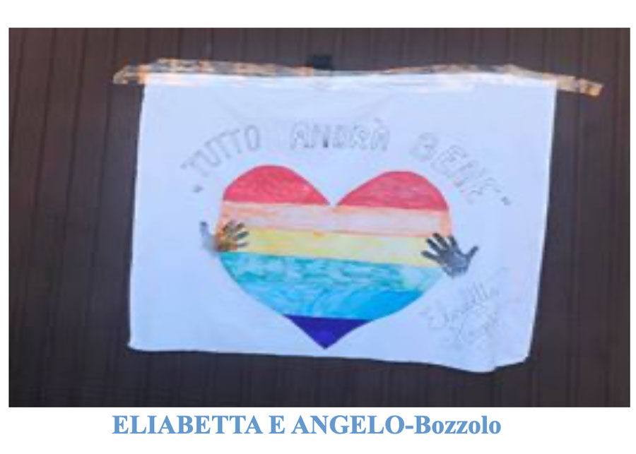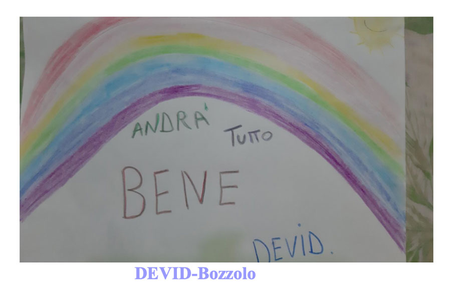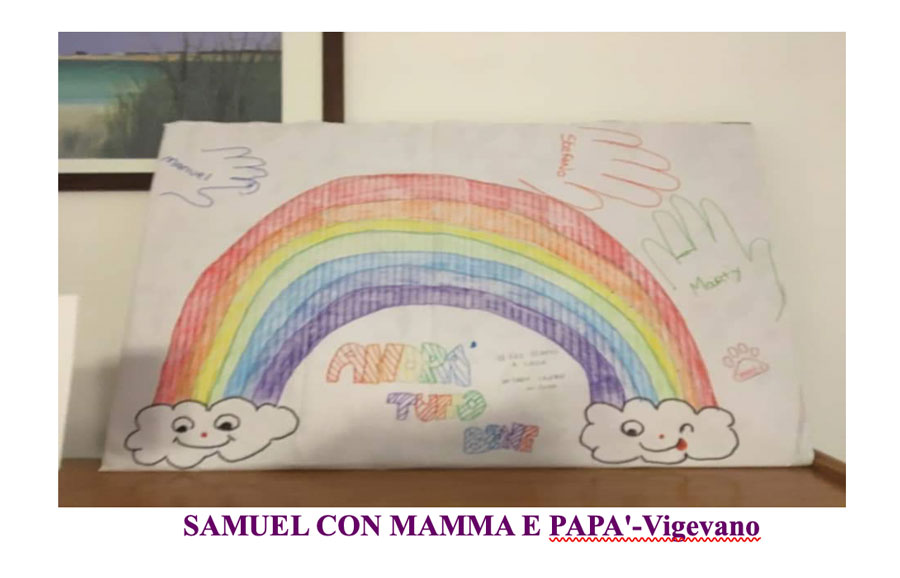 “Cartelloni che sono apparsi – spiega Benedetta – sul balcone del Municipio di Bozzolo, il mio paese (il cui ospedale intitolato a Don Primo Mazzolari si è riconvertito per ospitare malati Covid 19) ed affissi ai serramenti delle abitazioni e alle vetrine di molti paesi del territorio. Alla richiesta di mostrare sulla mia pagina Facebook i lavori realizzati dai bambini durante questo periodo di isolamento, la risposta è stata ampia e non circoscritta al solo territorio mantovano o cremonese. Da qui l’idea di raccoglierli e pubblicarli insieme per dimostrare la grande forza comunicativa di queste immagini: troverete gli arcobaleni di Alex e Lorenzo, disegnati per la finestra di casa e per il negozio da parrucchiera di mamma Elisa; quello della dolcissima Viola che lo ha attaccato sulla sua casetta dei giochi come a voler dirci “state a casa che siete al sicuro!” felice di avere vicini entrambi i genitori scrive mamma Monica per farsi coccolare e invente insieme nuovi giochi. Emily lo ha realizzato con tante manine colorate insieme a mamma e papà mentre quello di Nicholas è un tenerissimo collage di carta colorata, fiori e manine. Nonna Barbara mi ha mandato il disegno del suo nipotino Dante che vive a Brescia e rappresenta il “Signor Corona virus” come un sovrano comprendendone la potenza dirompente. Michele e Matilde hanno inserito vicino al loro arcobaleno la bandiera italiana per incoraggiarci e dirci che il nostro Paese ce la farà! Mamma Rita mi racconta che il suo Thomas ha voluto ringraziare chi lavora in ospedale e aiuta le persone a stare meglio, il fratello Nikolas ha disegnato un bambino con la mascherina rispettoso delle regole in contrapposizione ad un altro che non la indossa uscendo di casa, definendolo “furbetto”. Altri lavori di forte impatto emotivo sono stati realizzati dai bambini di diverse età dell’Istituto Comprensivo di Mantova 3. Ringrazio Daniela Cancellieri, l’insegnante che me li ha segnalati e fatti scoprire. Non vado oltre perché saranno le immagini a parlare e farci emozionare. Bambini diversi con la stessa voglia di raccontare in modo semplice la complessità della vita, con la loro creatività ci trasmettono grande coraggio rendendoli speciali… messaggi che mi hanno commosso e che ho scelto di condividere con voi tutti. Ed è pensando a loro e ai loro arcobaleni che ho scritto queste poche righe”.