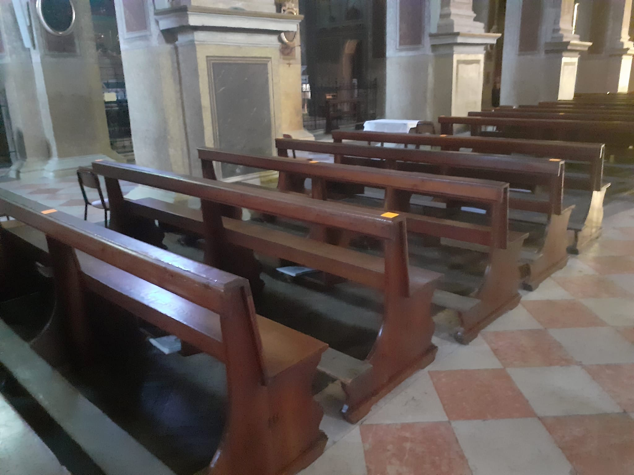 Su ciascun banco sono visibili tanti fogliettini di color arancione. Si tratta di post-it quadrati che fanno da segnaposto per indicare alle persone dove si possono mettere nel rispetto della distanza di sicurezza.