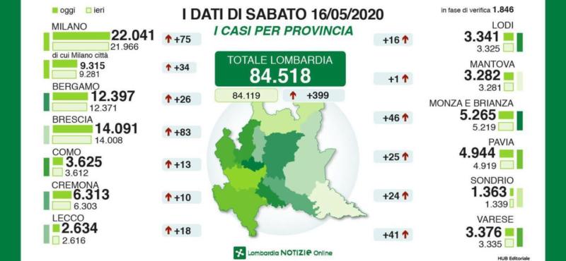 Alla vigilia della riapertura per attività come parrucchieri, bar e ristoranti, sono ancora tutti in crescita i dati sui contagi nelle province della Lombardia: complessivamente altre 399 persone risultate positive (ieri erano state 299 e ieri l’altro 522), per un totale di 84.518. In provincia di Cremona si contano 10 casi in più, quindi un po’ meno del giorno precedente (+18), per un totale di 6.303. Nessun decesso, inoltre, nel territorio cremonese nelle ultime 24 ore (totale 1.072), così come in quello mantovano (totale 668), dove si registra un solo nuovo contagio (3.282 casi da inizio emergenza).