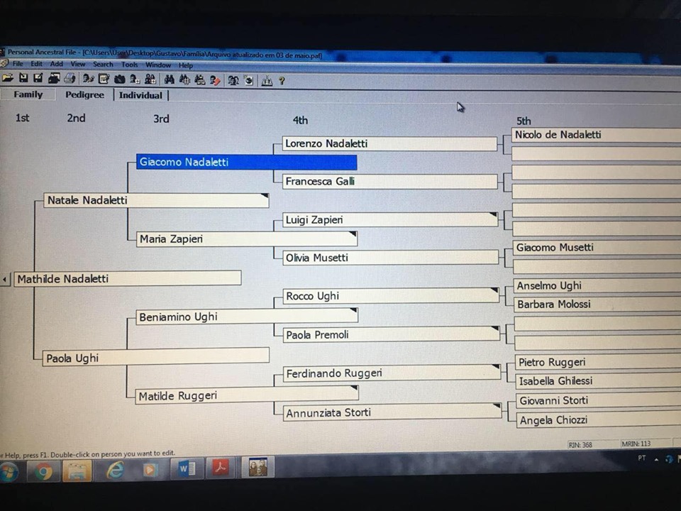 Mi piacerebbe tantissimo sapere se c’è qualcuno che si occupa della storia del Comune. Non bisogna essere uno sperto. Basta che abbia amore o sia inammorato della propria terra. Per quanto riguarda alla genealogia… (Ho fatto il compito di casa ed ho “sfrugnato” tutti i registri del sito antenati). E sono arrivato a questa situazione (albero in allegato). Per andare in dietro (bisognerebbe il contatto con la parrocchia – non so neanche se esistono altri registri).