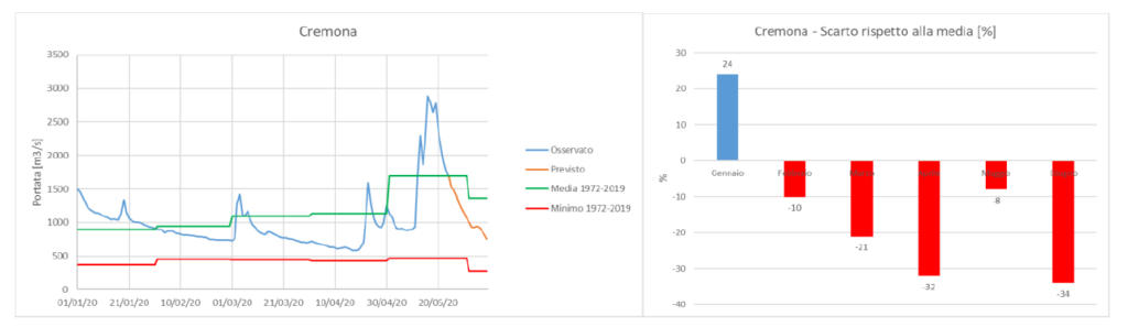 Nel mese di maggio, a seguito degli eventi osservati di precipitazione e le conseguenti risposte dei bacini idrografici in tutto il territorio distrettuale, le portate del fiume Po alle principali sezioni idrometriche evidenziano valori mensili confrontabili con le medie di lungo periodo. In particolare, alla sezione del Po a Pontelagoscuro il valore di portata giornaliera è stato pari a 2033 m3/s il 24 maggio u.s. mentre nel lungo periodo il valore medio mensile è di 2011 m3/s. Nella sezione di Cremona si segnala in data odierna un livello idrometrico di -3.90 m superiore al minimo storico (luglio 2005) pari a -7.80 m sullo zero idrometrico; anche a Boretto si registra un’altezza idrometrica (0,38 m) superiore al minimo storico (-4.50 nel luglio 2015).