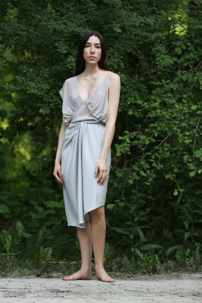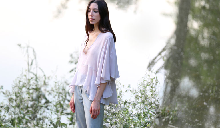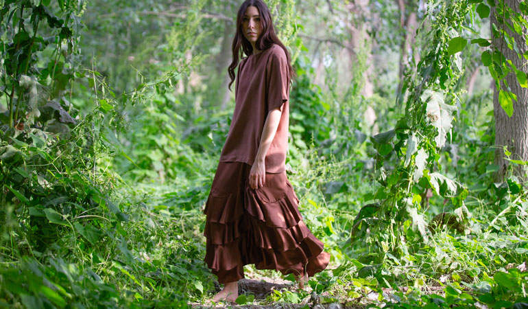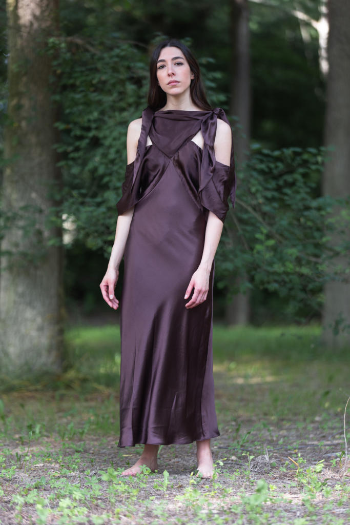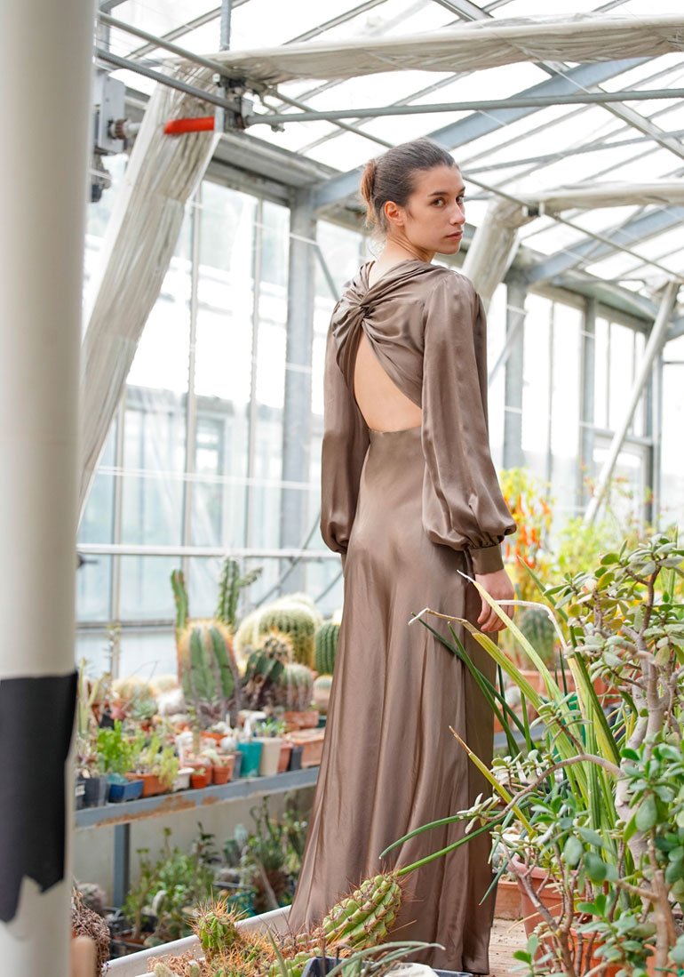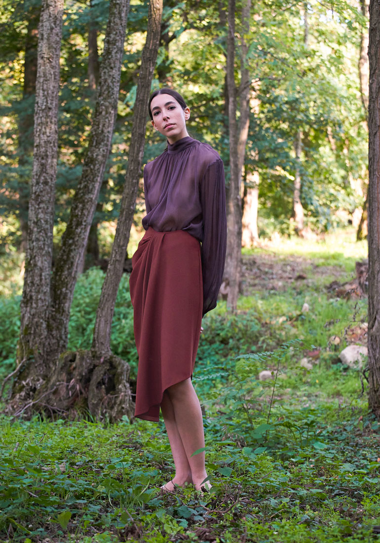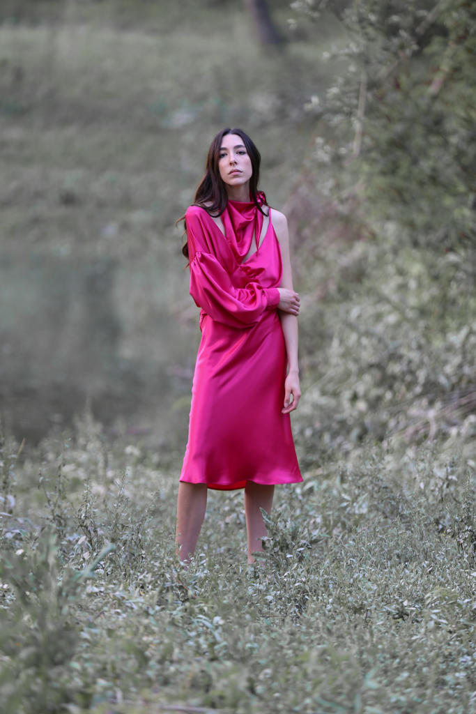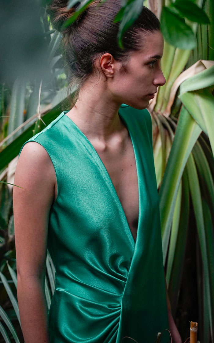“Scorci di luce e giochi di riverbero luminoso colorano la fitta boscaglia circostante. Leggere sete e delicati giochi di trasparenza suggeriscono quanta bellezza ci circonda. I colori del fitto bosco celebrano la naturale forza della donna che si addentra nei più profondi scorci della natura. La percezione di sé stessi si confonde e si dissolve tra fusti, fronde, fogliami e fulgori di immenso verde. Il Panismo è la chiave di lettura ideale e completa per figurarci immersi nella nostra natura, nella nostra terra, nel nostro tutto circondati da pulsante cosmo”.