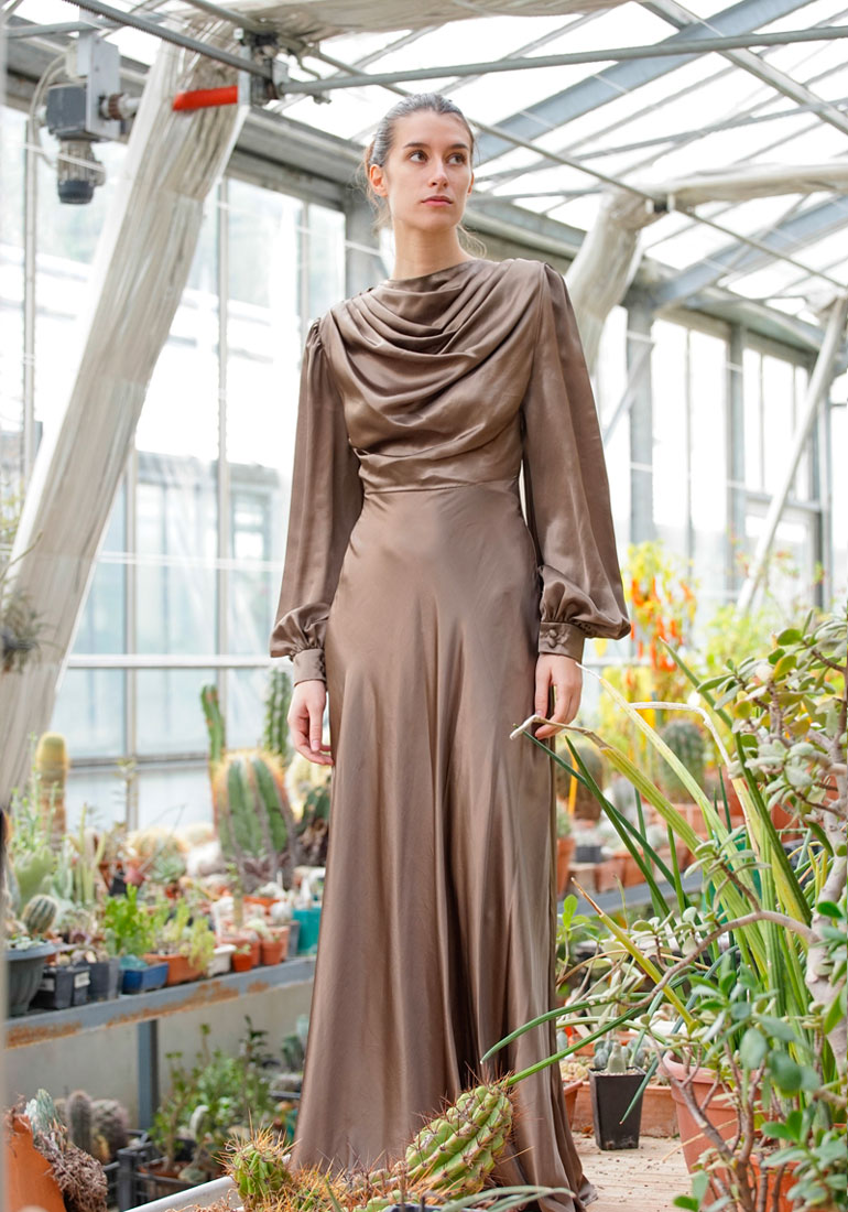 “Come donna e terra inesorabilmente legate ed eternamente complementari sono raccontate nel mito greco della Dea Demetra, così ho racchiuso nel mio concetto di stile tutta la spontaneità che scaturisce dall’incontro tra bellezza e natura in una perfetta e potente statua greca. Il vivo rosso porpora si consuma ma è come se non fosse mai scomparso dall’anima scultorea che lo vestiva. Il dramma del trascorrere inesorabile si dissolve in questa sublime combinazione di gradazioni che ritrae insieme ciò che era e ciò che rimane”.