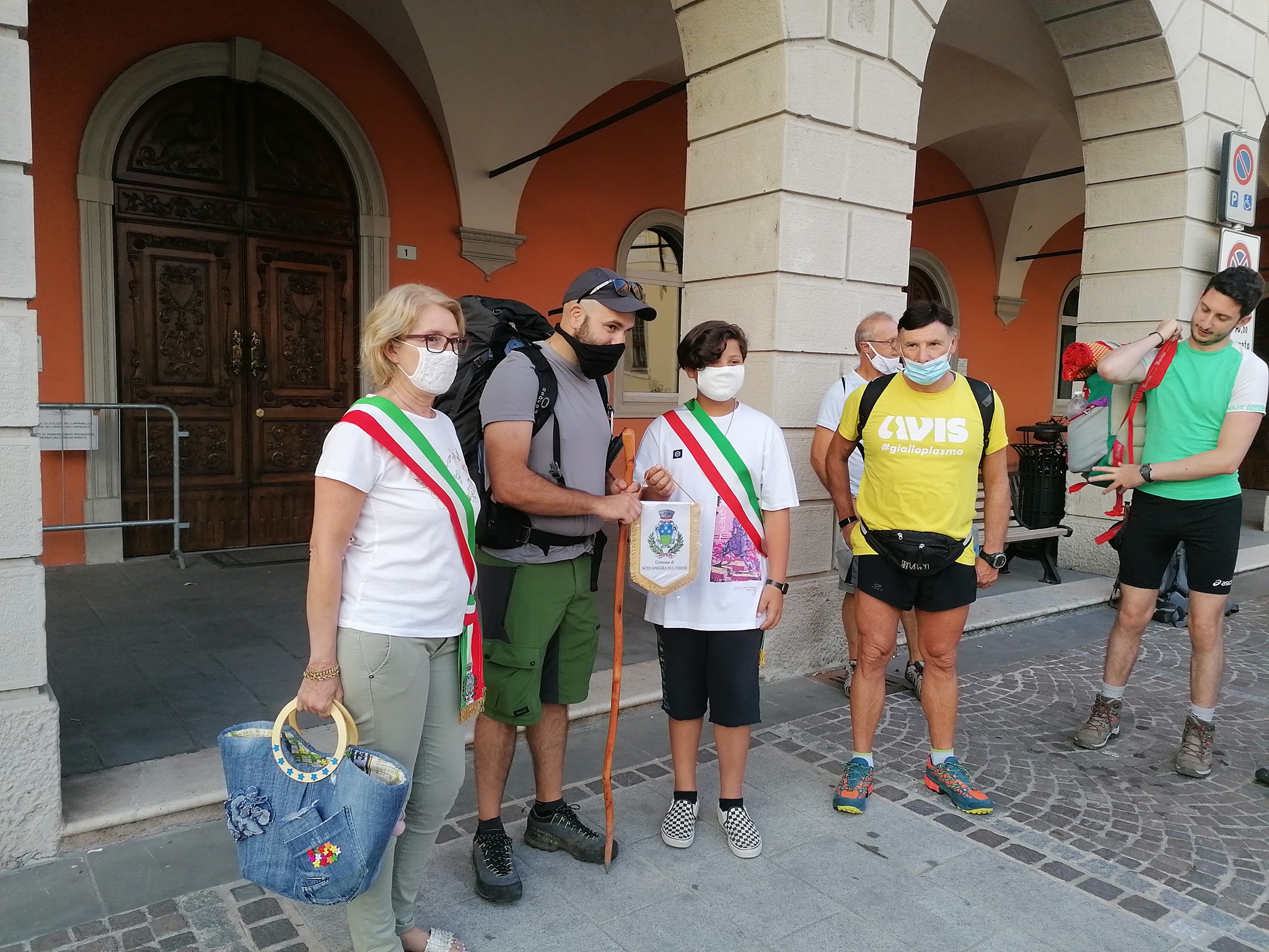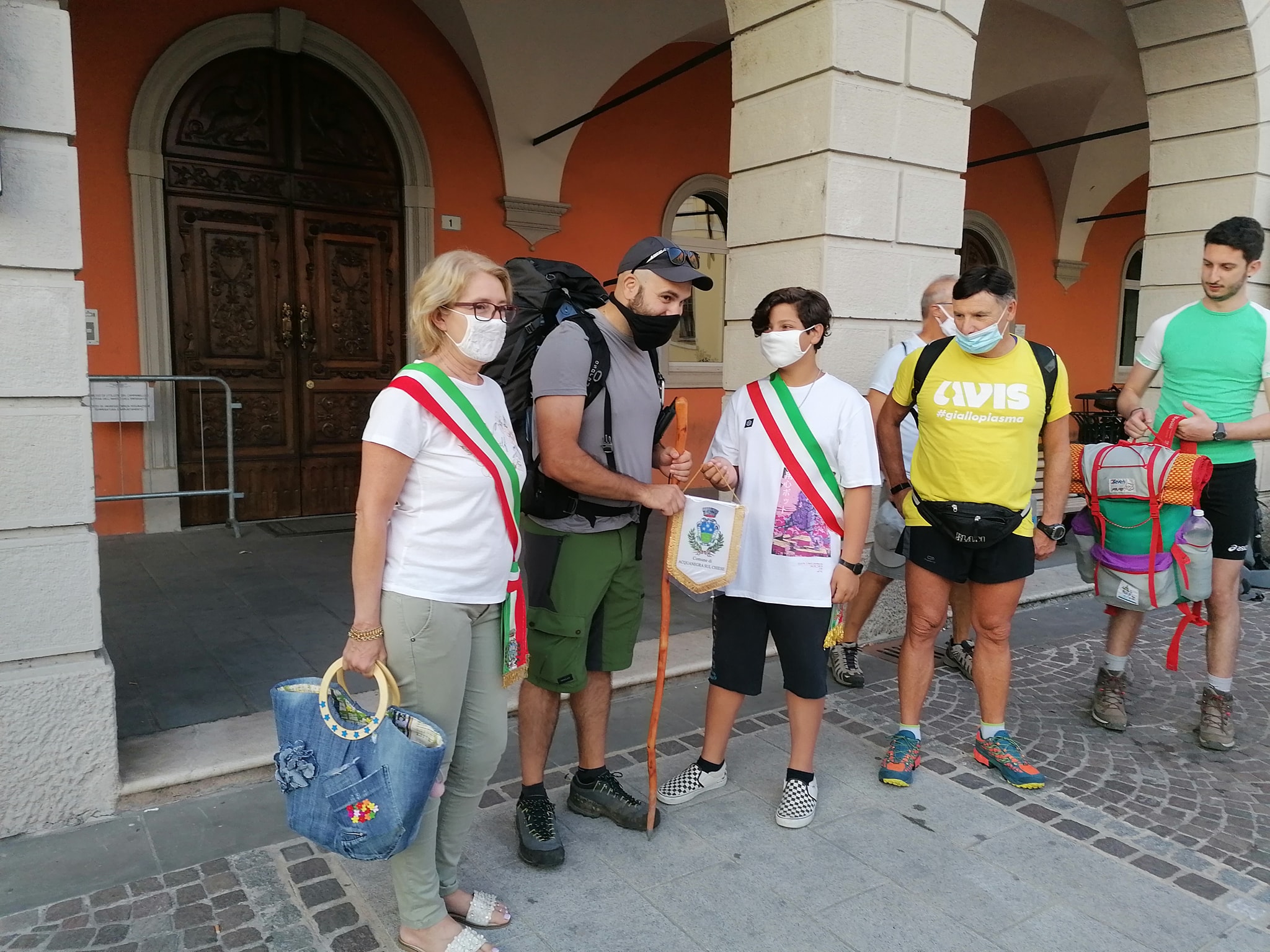 ACQUANEGRA SUL CHIESE – Benedetti dal sole e dalla speranza che finalmente si possa mettere mano, e con coraggio, a quell’immensa ricchezza che è il Chiese. I viandanti di ‘Al passo del Chiese’ sono partiti questa mattina alle 6.30 dal piazzale del municipio di Acquanegra sul Chiese. A salutarli la Prima Cittadina Monica De Pieri, il primo cittadino del Consiglio Comunale dei bambini che hanno consegnato ai viandanti il gagliardetto del comune da consegnare al sindaco della Val Daone, a testimonianza di unità e fratellanza sull’intero percorso. Il tragitto, poco più di 24 km, ha portato il gruppo guidato da Mirko Savi lungo un percorso reso duro, soprattutto nella parte finale, dall’intenso caldo.