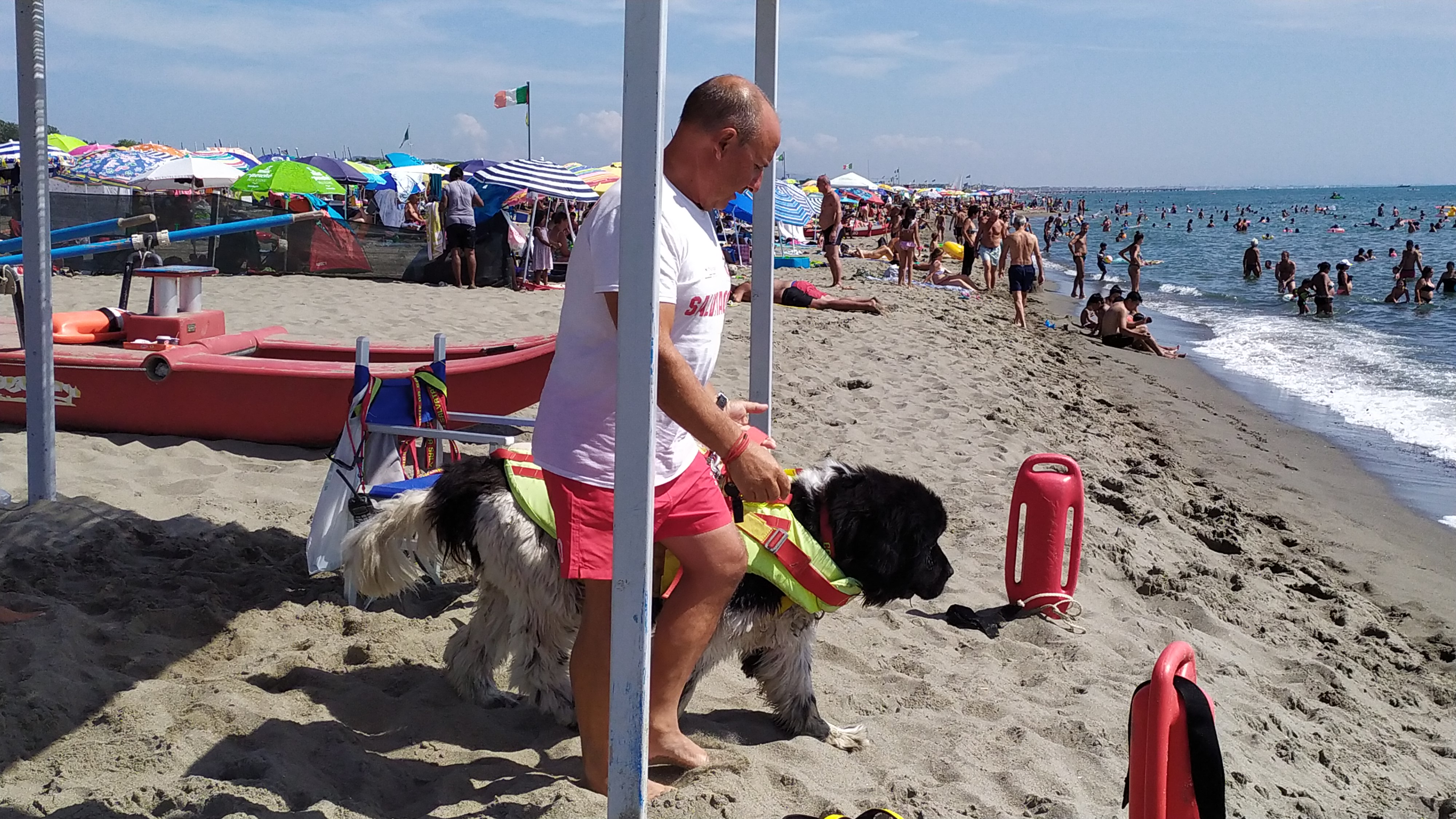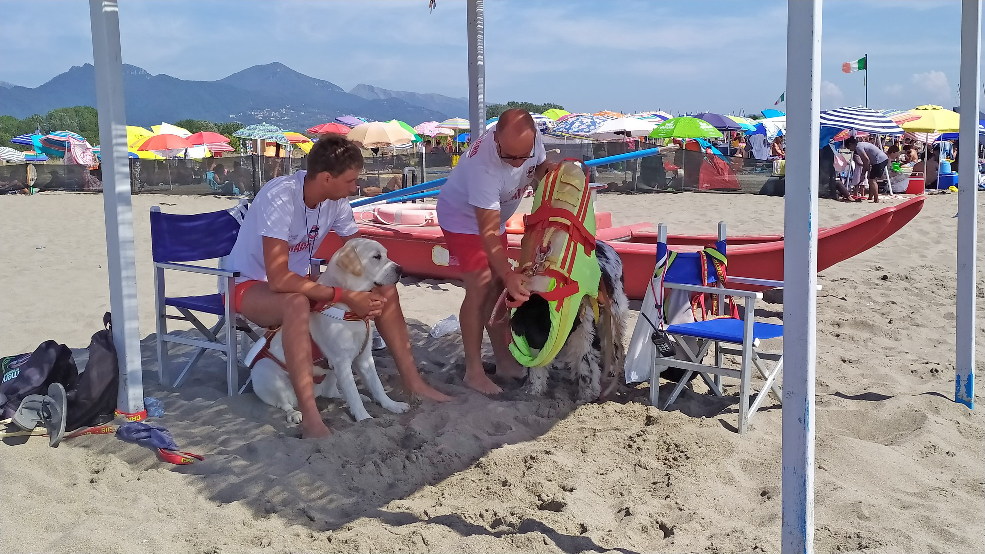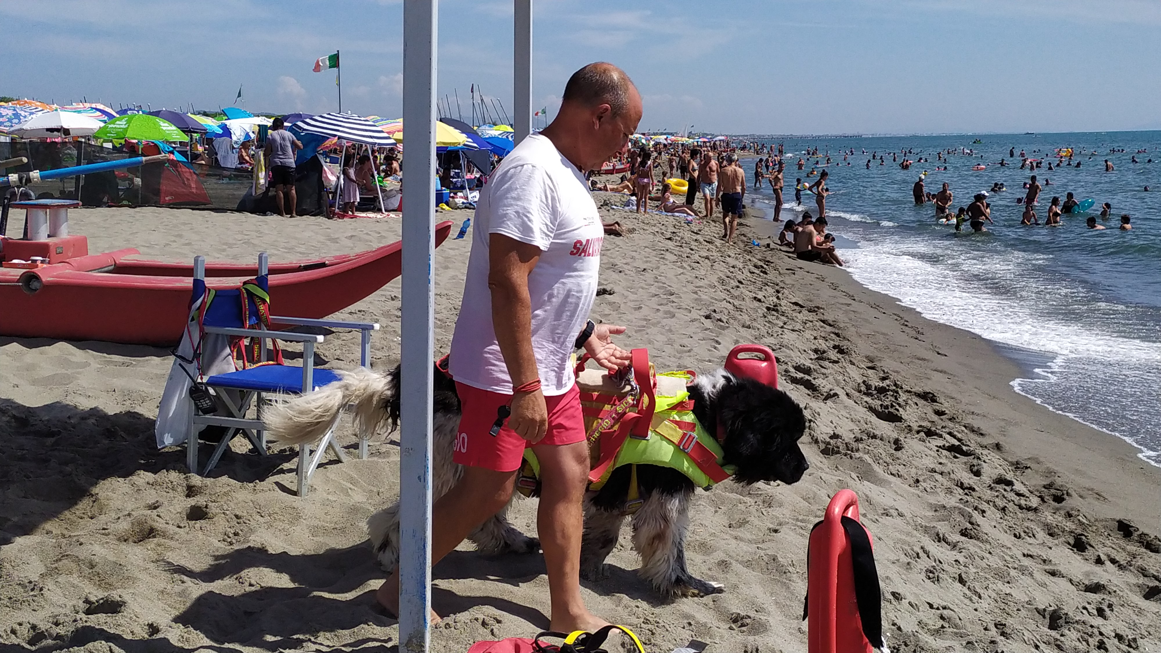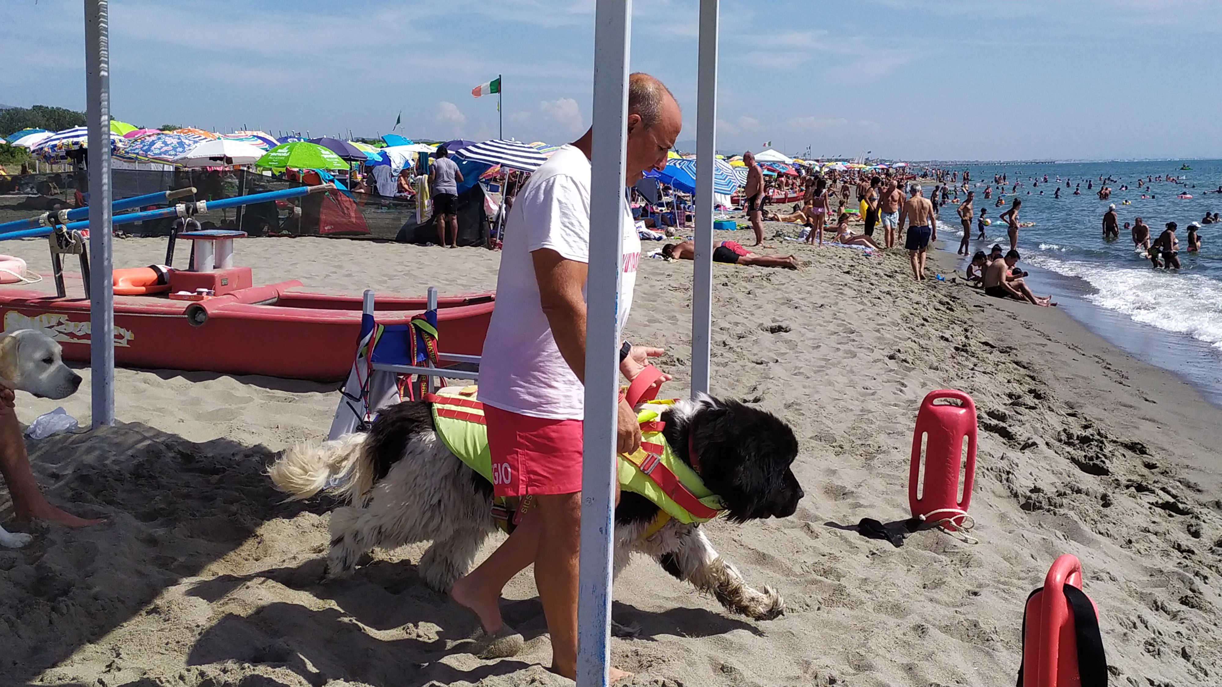 Da quest’anno, grazie ad un accordo con la società che gestisce le spiagge libere della zona e anche quella del nostro Comune, come da accordo stipulato con l’Amministrazione di Filippo Bongiovanni, i cani della SICS sono di stanza proprio davanti ai nostri gazebo balneari in ogni weekend. Abbiamo incontrato Loris e Rhea (una Terranova di 10 anni) e Lorenzo e Potter (Labrador di un anno e mezzo): l’intesa tra uomo e cane è perfetta; i due cani sono obbedienti e tranquilli, pur se ansiosi di raggiungere l’acqua; sono stati addestrati per lunghi mesi e proprio durante alcuni di questi addestramenti dal mese di maggio ad oggi hanno portato in salvo 3 persone. Loris ci spiega che i cani sono motori intelligenti: “Il loro compito sostanzialmente è quello di aiutare noi bagnini a riportare a riva la persona in difficoltá. Ci fanno da traino. Sono motori pensanti, percepiscono e sfruttano le correnti sottomarine per raggiungere più in fretta la salvezza”. Lorenzo aggiunge che per un salvataggio è meglio la coppia uomo-cane che non uomo-uomo: “Il cane aiuta molto di più l’operazione di traino e di risalita della corrente: la sua forza è incredibile!”