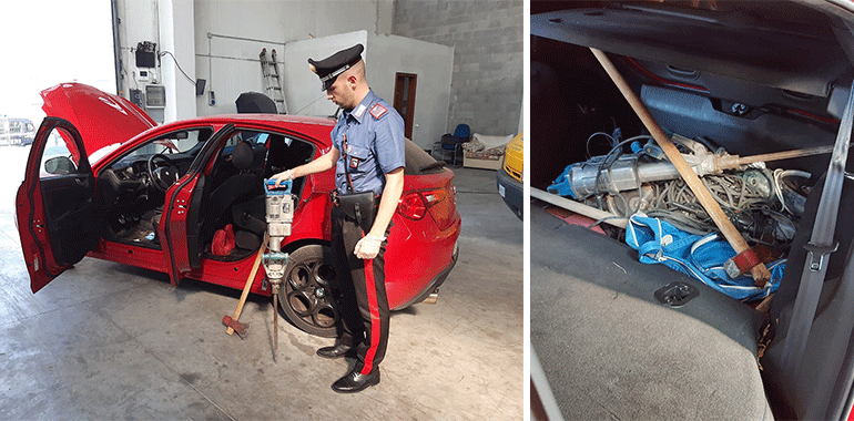 A bordo del mezzo (risultato rubato a Due Ville, in provincia di Vicenza) un arsenale di arnesi da scasso, compreso un martello pneumatico ed una batteria, che hanno subito fatto pensare alla banda dei bancomat. Una banda organizzata e ben fornita insomma, pronta a colpire. L’auto è adesso a disposizione dei carabinieri che stanno effettuando tutti i rilievi di rito a caccia di tracce che possano portare all’identificazione degli uomini a bordo.