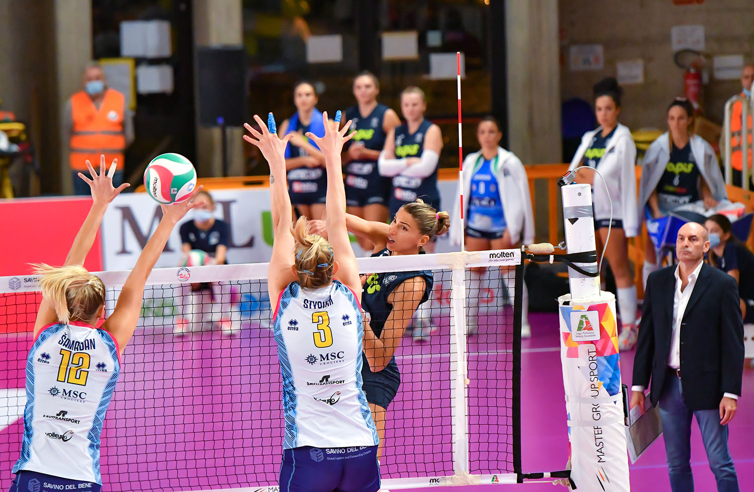 Primo set. E’ Pietrini ad aprire le danze alla conclusione di un bellissimo scambio pieno di capovolgimenti di fronte da una parte e dall’altra, Samadan però manda fuori il suo tentativo ed è 1-1. Ci pensa poi Montibeller a portare avanti Casalmaggiore con un tocco morbido, 2-1. Il primo muro della gara è una “stampata” di Vasileva su Stysiak, 4-2. Cannonata in diagonale di Montibeller sulla quale la difesa toscana non può nulla, 6-3, Malinov però con un tocco di seconda accorcia. La pipe di Vasileva è vincente, Casalmaggiore si porta sul 9-5 e coach Barbolini chiama il primo time out della gara. Murone di Melandri sull’opposta polacca e Casalmaggiore fa 12-6, il muro di Montibeller poi allunga nuovamente. Il primo ace della gara è di Partenio che beffa la difesa toscana e sigla il 15-7, time out Savino del Bene. Al ritorno in campo, Drewniok manda fuori il suo tentativo e regala il sedicesimo punto a Casalmaggiore. Melandri è attenta e in smash sigla il 17-7, grande salvataggio in precedenza di Sirressi. Melandri è invalicabile, Pietrini ci prova ma è muro della numero nove casalasca, 18-8. L’infrazione in palleggio fischiata alle toscane regala il 20-8 alla Vbc Èpiù Casalmaggiore. Super fast di Stufi che fende il campo e fa 21-9, Partenio in pipe allunga. Altra fast del capitano che manda le sue sul 23-11. Il set point è frutto della pipe di Montibeller che sigla il 24-12, Bajema alla battuta. E’ Montibeller a chiudere 25-12. Top scorer: Pietrini 4, Montibeller 5