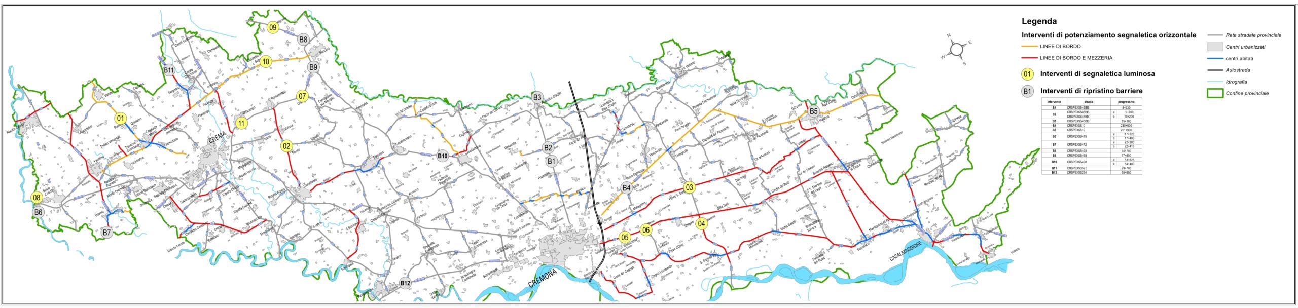 Ha continuato Signoroni: “Il progetto ha come obiettivo il miglioramento delle condizioni di sicurezza della circolazione veicolare sulla rete stradale provinciale in principal modo attraverso il contrasto dei fattori di rischio agendo in particolare su quelli direttamente correlati alla presenza ed all’efficacia della segnaletica stradale orizzontale, verticale, luminosa e delle barriere di sicurezza stradale.Nello specifico i lavori consistono nel rifacimento della segnaletica orizzontale con l’impiego di materiale termoplastico su diverse strade della rete provinciale (tra cui le SS PP 27 “Postumia”, 85 “Bassa di Casalmaggiore”, 87 “Giuseppina”, 343 “Asolana” nell’area orientale della Provincia e le SS PP 04 “Rivoltana”, 05 “Montodine Casaletto Ceredano”, 17 “Bagnolo – Casaletto Ceredano”, 20 “Castelleone- Casaletto di Sopra”, 591 “Cremasca” nell’area occidentale), nella realizzazione di bande ottiche-acustiche quali dissuasori di velocità per i veicoli (ad esempio sulla SP 33 “Seniga – Isola Pescaroli”), nell’installazione di dispositivi luminosi per consentire una migliore percezione della segnaletica stradale nei punti di maggior criticità in corrispondenza di intersezioni (ad esempio sulla SP 02 “Crema – Vailate”, sulla SP 20 “Castelleone- Casaletto di Sopra”, sulla SP 27 “Postumia” e sulla SP ex SS 498 “Soncinese”), di limiti di velocità (ad esempio su SP ex SS 235 “Di Orzinuovi”, SP 24 “Soresina – Fiesco”), curve (su SP 44 “Soncino – Casaletto di Sopra” ed SP ex SS 415 “Paullese”), attraversamenti pedonali (su SP 87 “Giuseppina” e SP 24 “Soresina – Fiesco”) e nell’installazione e/o ripristino di barriere di sicurezza (ad esempio su SP ex SS 10 “Padana Inferiore”, SP ex SS 45bis “Gardesana Occidentale” ed SP ex SS 498 “Soncinese”). La fine lavori è prevista nel mese di gennaio del 2021”.
