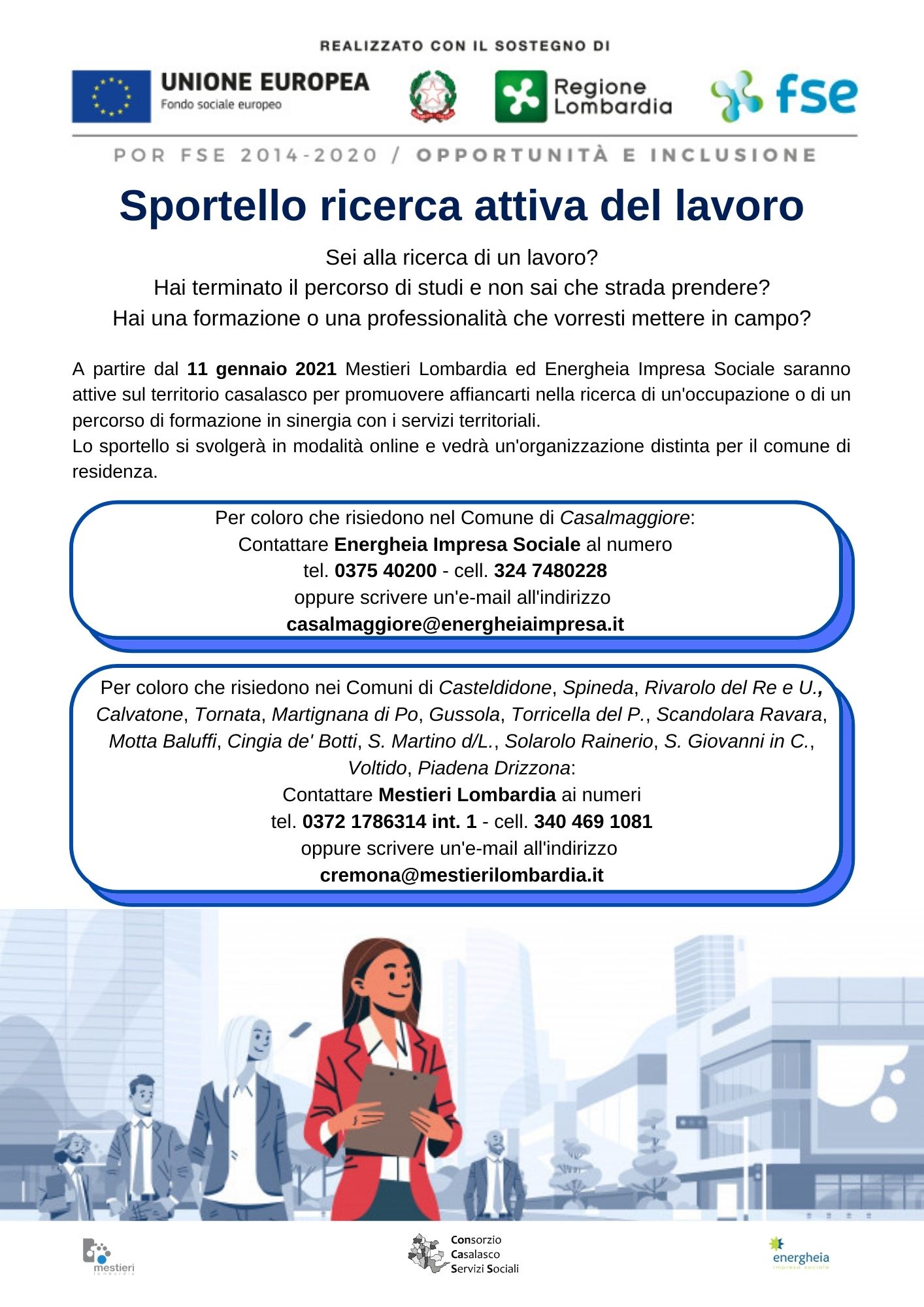 Per i/le cittadini/e dei Comuni di Casteldidone, Spineda, Rivarolo del Re e U., Calvatone, Tornata, Martignana di Po, Gussola, Torricella del P., Scandolara Ravara, Motta Baluffi, Cingia de’ Botti, S. Martino d/L., Solarolo Rainerio, S. Giovanni in C., Voltido, Piadena Drizzona contattare Mestieri Lombardia ai numeri tel. 0372 1786314 int. 1 – cell. 340 4691081 oppure scrivere un’email all’indirizzo cremona@mestierilombardia.it