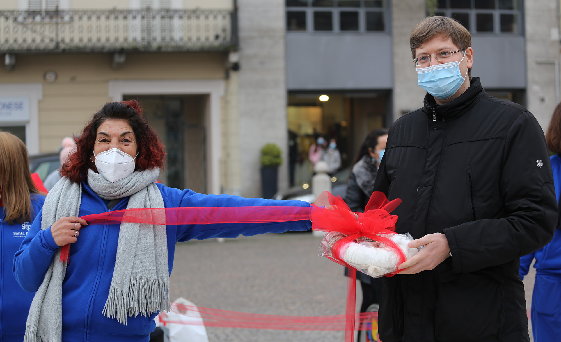 La Cooperativa Santa Federici, partendo dai ragazzi ospiti e andando fino ai vertici, con massima attenzione al distanziamento, ha animato la piazza, alla presenza anche di don Claudio Rubagotti, abate parroco di Casalmaggiore con cappello da elfo, che ha evidenziato i passi avanti fatti nella cura della disabilità. Un saluto è giunto anche da Alessandro Portesani, presidente della Cooperativa, che con Cristina Cirelli in prima linea ha organizzato balletti e coreografie in accordo con la DAAS di Luisa Sartori, che segue i ragazzi nella parte motoria. Alla fine tra “Jerusalema”, hit dei nostri tempi, e un classico come “Hallelujah”, le “Buone feste” e gli applausi sono arrivati per tutti.