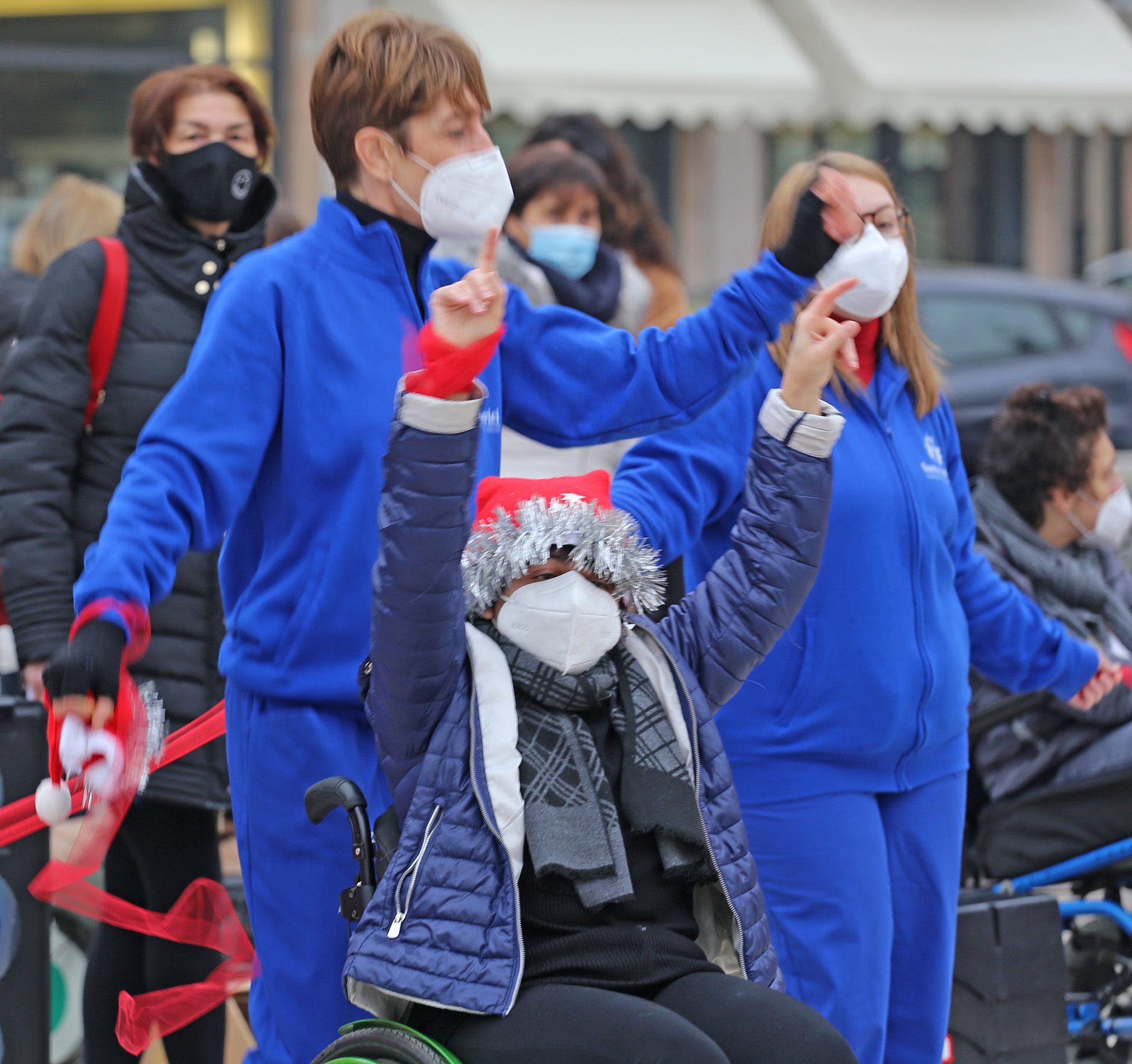 CASALMAGGIORE – Finalmente è Natale anche per loro. Ed è un Natale straordinario anche per la città. Il Covid s’è spento, per un ora, nella loro voglia di movimento e nei loro sorrisi e l’energia trasmessa è stata davvero tanta. Insieme all’emozione. I ragazzi di Santa Federici e gli operatori della cooperativa hanno – nel rispetto delle restrizioni Covid – animato la piazza.