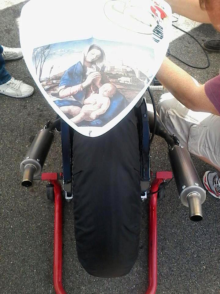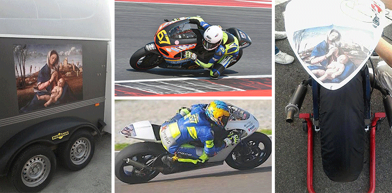 Sul cupolino e sul casco del giovane centauro piemontese, Alessandro Pozzo, spicca l’immagine sacra. Nel 2014 con Savazzi ha l’idea folle di correre e si confida con gli amici di sempre che sentono parlare di una Yamaha 250 da costruire ed iscrivere ad una competizione internazionale. Gli sguardi inizialmente perplessi sono spiazzati poi dalla determinazione e dall’ostinazione a non arredersi alle molte difficoltà iniziali superate dalla passione… e dalla fede!