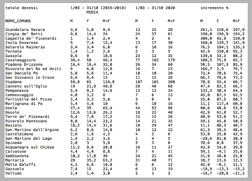 E’ stato pubblicato oggi il report dell’ISTAT relativo ai decessi. Un dato comparato tra la media 2015/2019 dei primi dieci mesi dell’anno e il numero dei decessi dei primi dieci mesi del 2020. Che il Covid abbia influito sulla crescita dei decessi è abbastanza evidente in area Oglio Po.