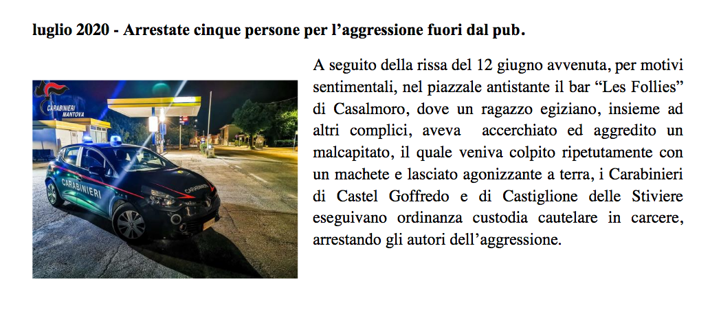 In ogni caso, l’andamento dei delitti nell’ultimo anno in tutta la provincia di Mantova ha segnato un calo pari al 11,4% rispetto al 2019, a testimonianza proprio dell’impegno profuso dall’Arma dei Carabinieri e dalle altre forze di polizia, sotto la direzione, guida e coordinamento del Prefetto della Provincia di Mantova, Michele Formiglio, e del Procuratore Capo, Manuela Fasolato, oltre a tutti i magistrati della Procura della Repubblica di Mantova, sempre vicini nell’arginare il crimine. In particolare, nella provincia di Mantova si evidenzia, la diminuzione: