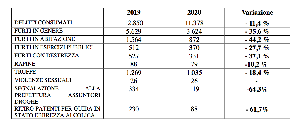 • dei furti: 3.624 (contro i 5.629 nel 2019) di cui 3.435 perseguiti dai Carabinieri.