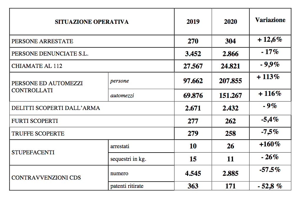 Con riferimento ai significativi risultati operativi il costante controllo del territorio espresso con 25.514 servizi, ha consentito di controllare 207.855 persone (97.662 nel 2019) e 151.267 vetture (69876 nel 2019).