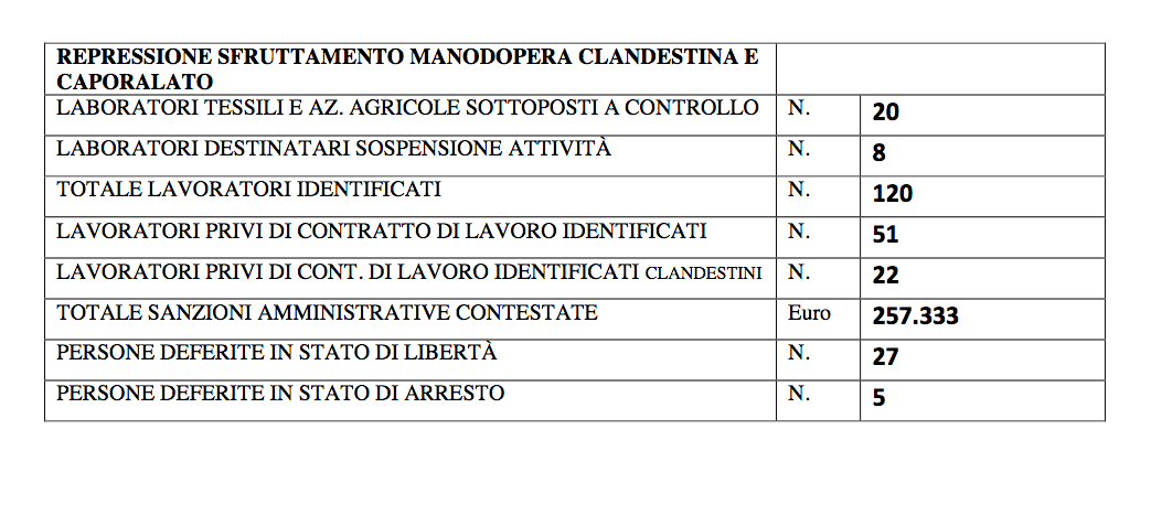 • sono stati controllati 120 lavoratori, individuati 51 lavoratori irregolari in “nero”, irrogate sanzioni amministrative per 257.333 mila Euro, deferite 5 persone in stato di arresto e 27in stato di libertà.