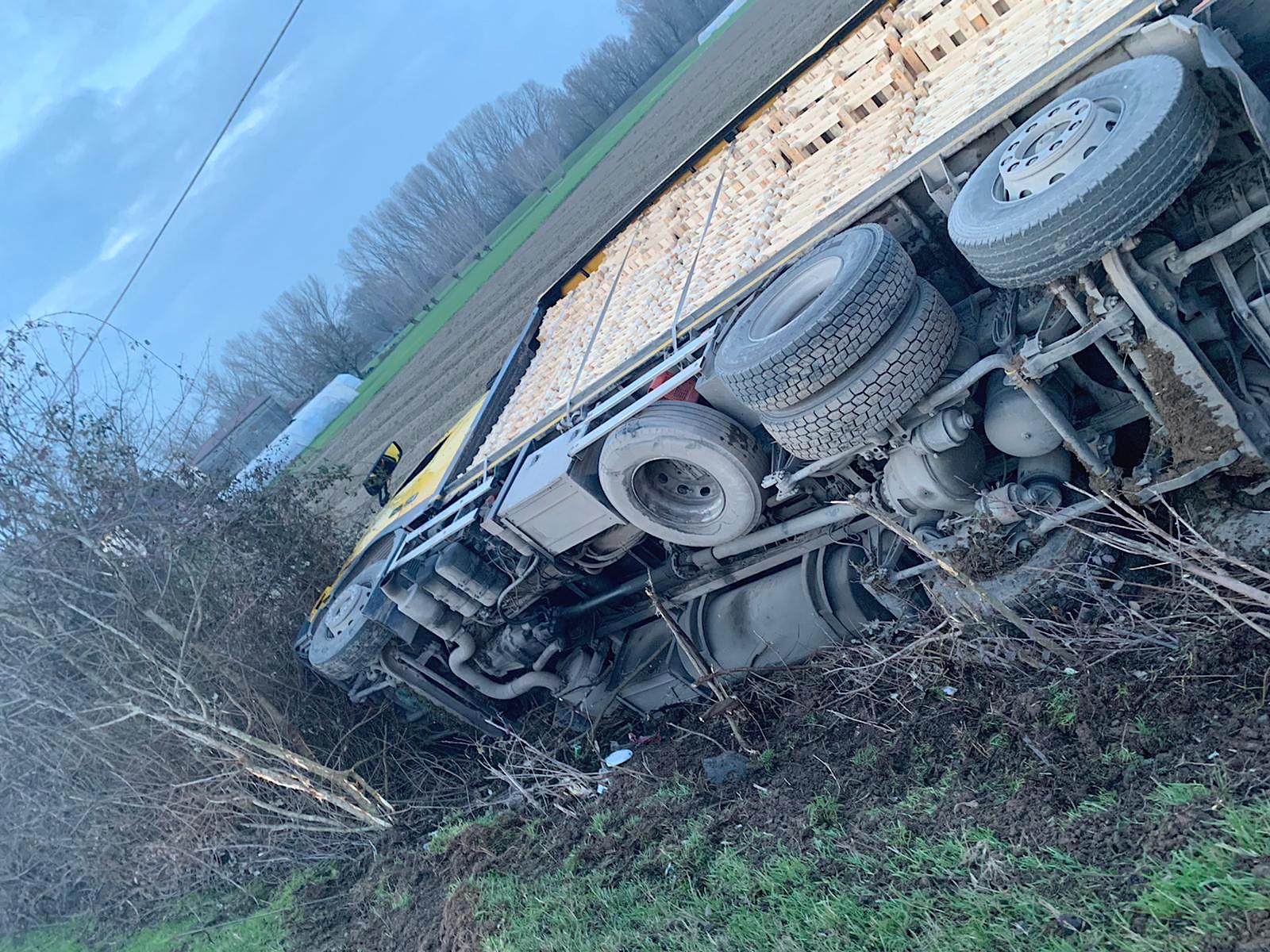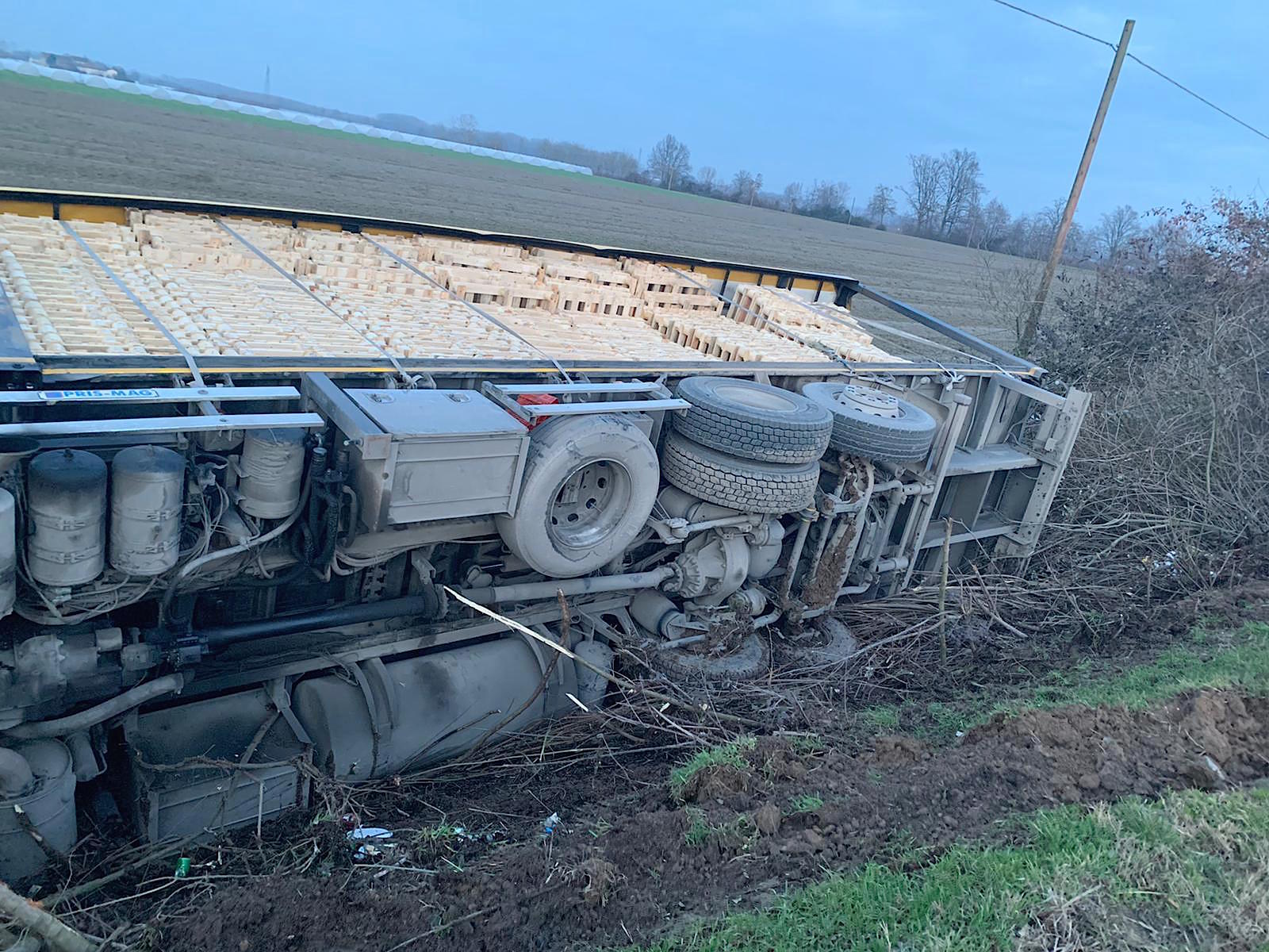 Poco dopo l’abitato di Squarzanella al termine di una curva un camion Volvo carico di bancali in legno si è rovesciato a lato piegandosi su un fianco.
