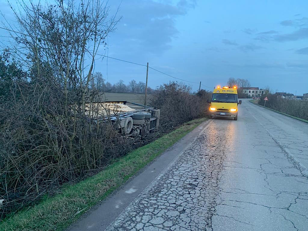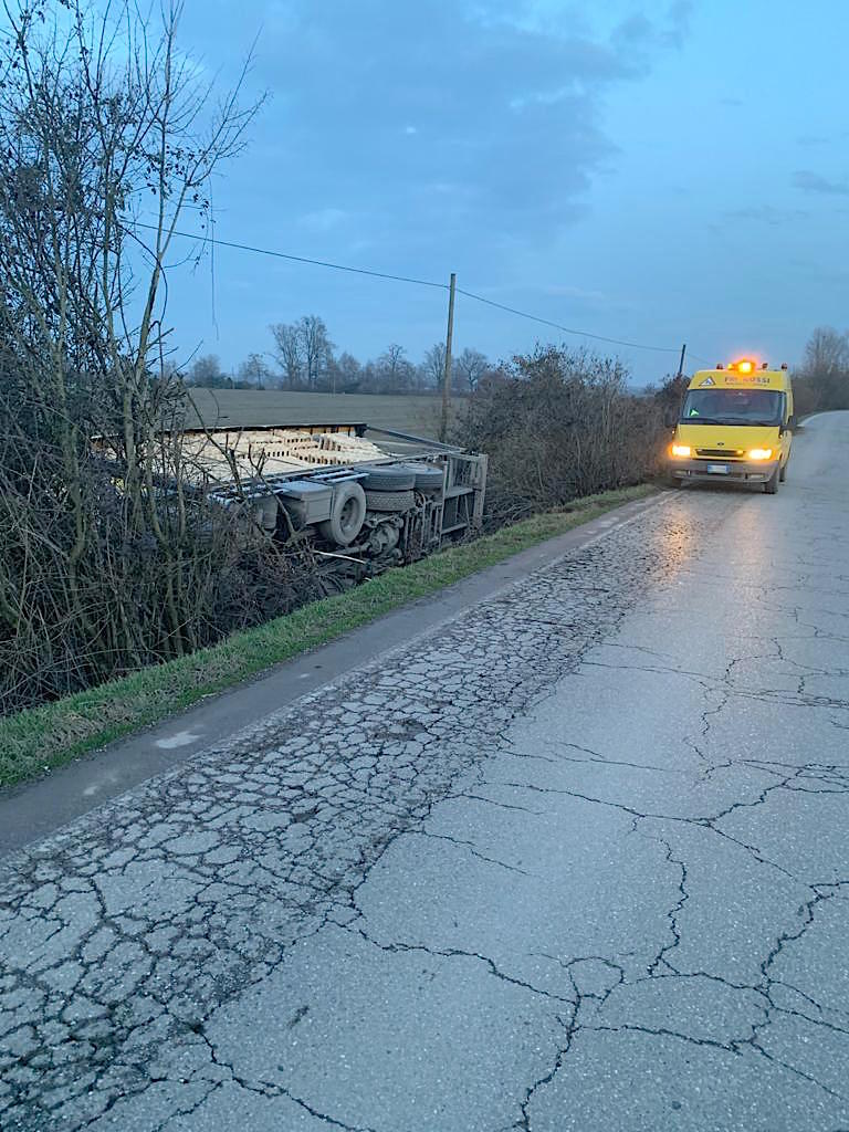 Provinciale tra Viadana e Gazzuolo, banchina cedevole, camion si rovescia in un campo