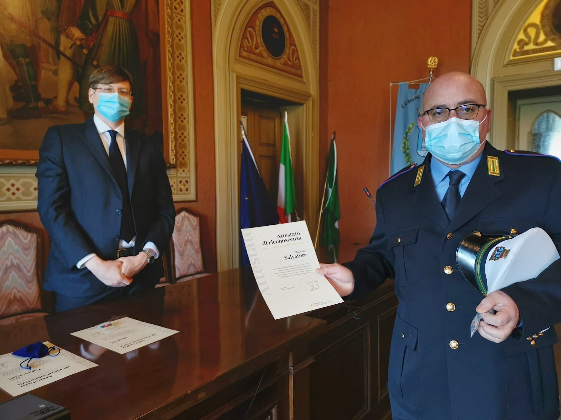 “Inizialmente – ha spiegato il primo cittadino – la Regione ci aveva chiesto di segnalare due uomini per la benemerenza. Ma quando ci siamo trovati tra noi abbiamo subito detto che quella benemerenza la meritavano tutti indistintamente. Abbiamo segnalato tutti gli uomini in servizio alla Polizia Municipale e la Regione, alla fine ci ha accontentato. Questo premio avrebbe dovuto essere consegnato loro a novembre direttamente dal presidente Attilio Fontana a Milano, ma poi, viste le restrizioni legate al Covid, quell’evento non si è potuto svolgere e il premio glielo diamo noi”.