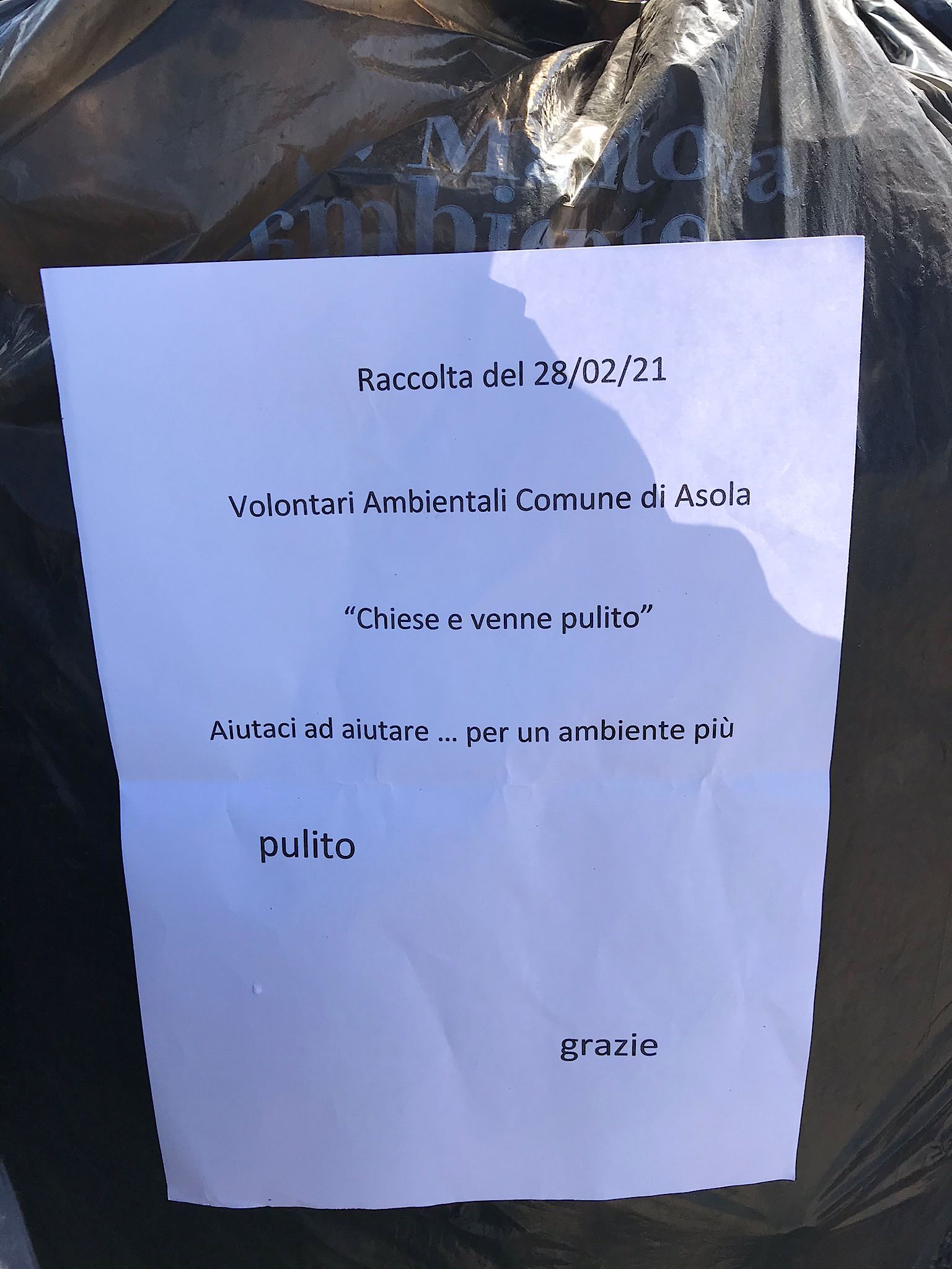 “E’ bello – aggiunge Fabrizio Rossi – vedere che operare per la collettività può generare simpatia. In due ore e mezza si sono percorsi al massimo mille metri, dei 2500 previsti, con una raccolta davvero gigante di 30 sacchi stracolmi, da aggiungersi alla quindicina recuperati dai Boys&Girls di Baden Powell. Una gioia per gli occhi, un pugno allo stomaco se si pensa a quanta spazzatura ci sia lungo le nostre strade extraurbane. Un tratto tra l’altro, che a maggio sarà luogo di passaggio di una tappa del Giro d’Italia. Ancora una volta l’intervento del furgoncino vintage di Franco Scapini si è rivelato strategico, ripreso anche dal geniale apporto del Drone di Jack Perini! Bellissimo vedere la gioia negli occhi di Franca, vedendo 50 persone che si sono date appuntamento nella sua Asola, per questa che sembra sempre una lotta contro i mulini a vento. Lotta, che per tutti noi presenti, non finirà”.