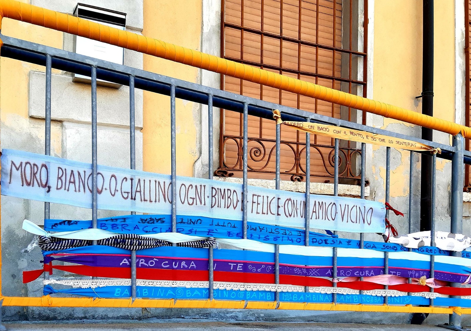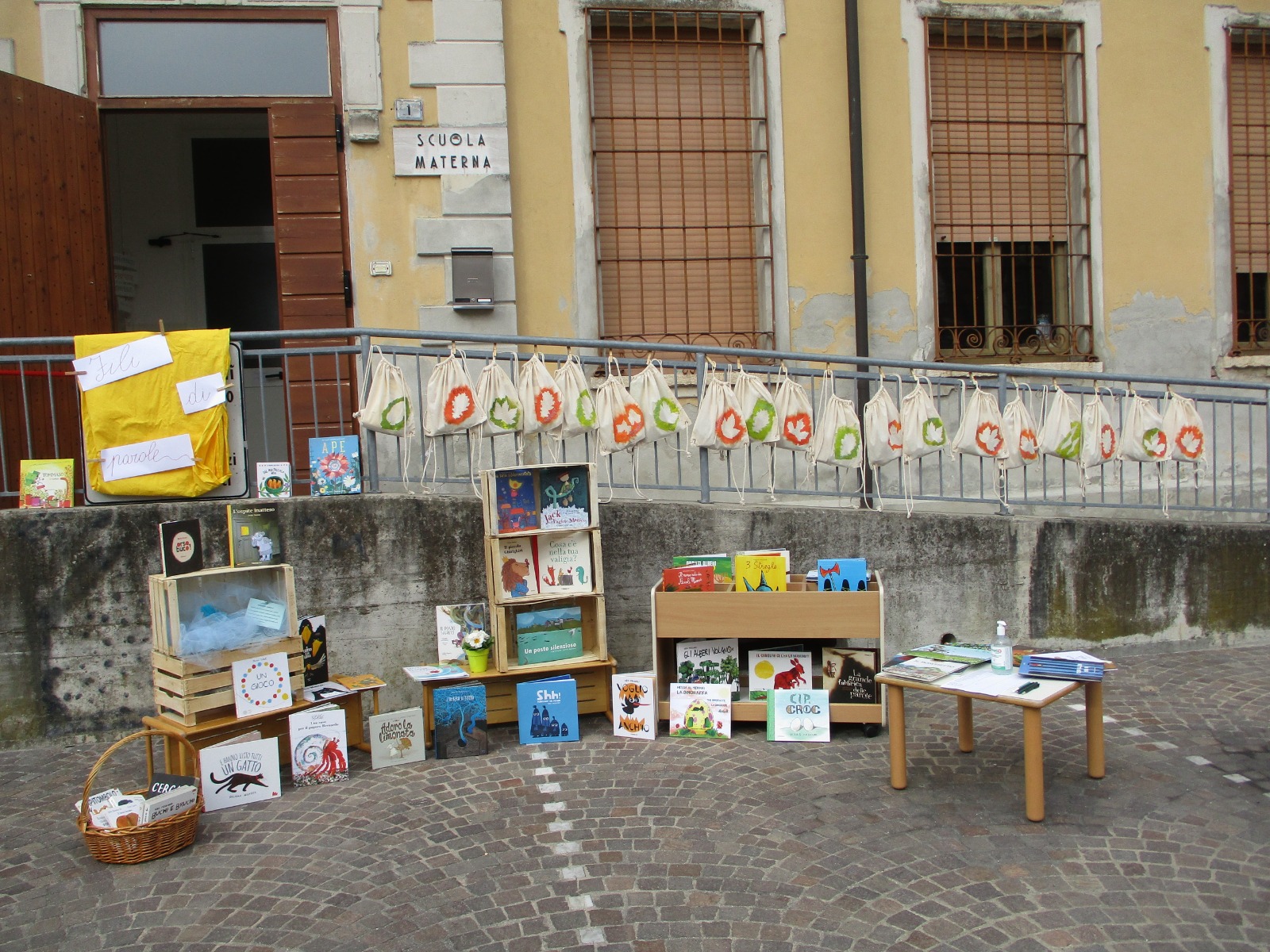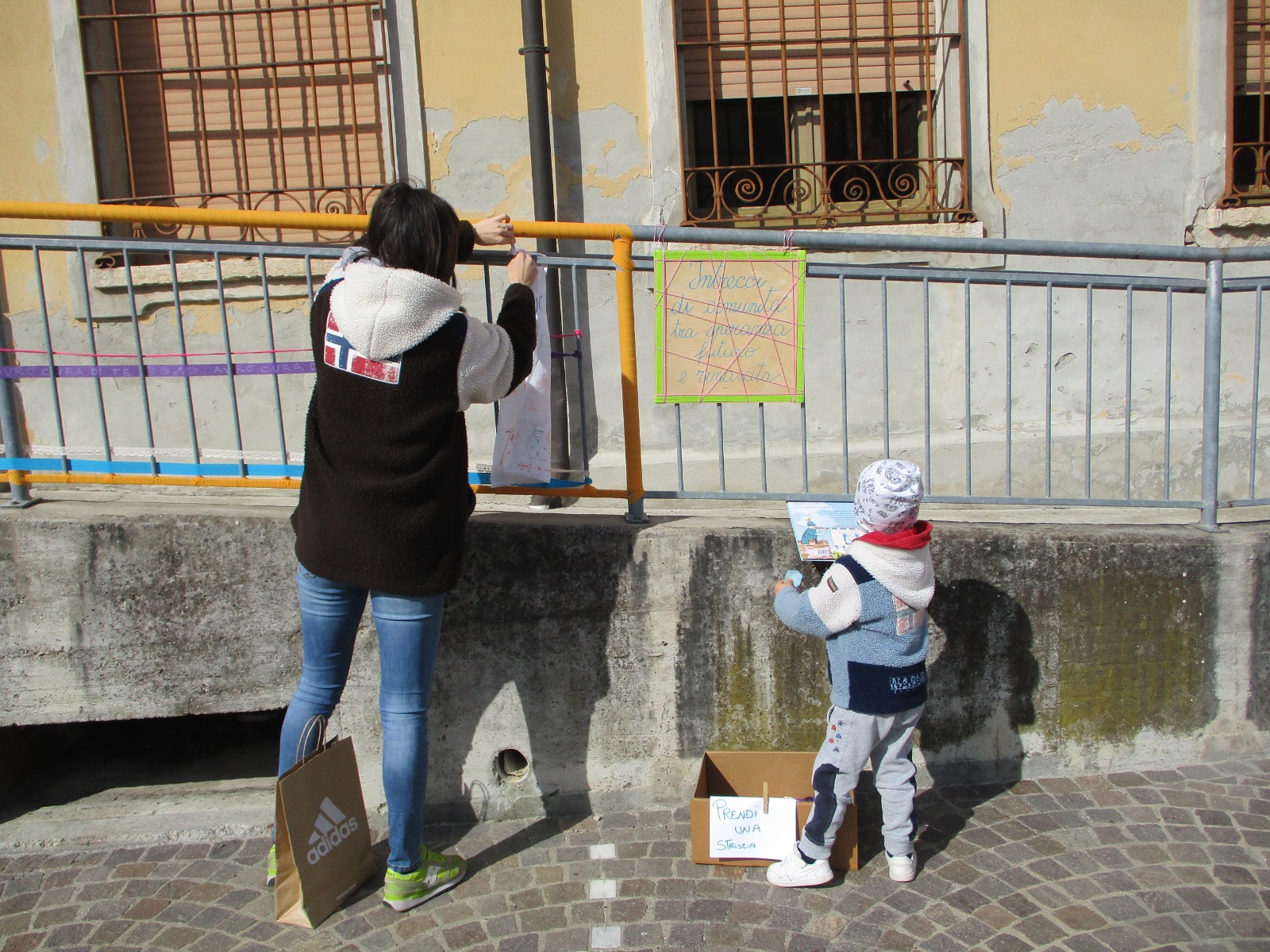 Oltre al telaio che raccoglie le strisce colorate e scritte la scuola ha pensato a ‘fili di parole’. Un’altra bella iniziativa che serve a mantenere i contatti. Ogni giovedì mattina, in piazza (perché la scuola è proprio lì) viene allestita una piccola biblioteca. Le famiglie con i bimbi vanno a prendere un libro e a restituirne un altro. E intanto i bambini vedono le maestre, scambiano due parole, magari incrociano qualcuno dei compagni di scuola.Perché anche l’aspetto sociale è importante.