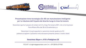 Domani la Geosintesi Spa azienda leader per l’ingegneria ambientale e la manutenzione delle infrastrutture, insieme alla Multinazionale Bayer, alle 10 presso la Fiera di Milano Rho, in occasione dell’Expo ferroviario, presenterà il nuovo treno tecnologico che modera l’impatto del diserbante glifosate lungo linea di Rete Ferroviaria Italiane e FerrovieNord di Milano, grazie ad un nuovo sistema di riconoscimento delle specie infestanti presenti e un miglior dosaggio delle miscele di diserbo, questo sarà possibile grazie a sistemi avanzati di erogazione del diserbo che agiranno puntuali sulla vegetazione e non più a getto continuo lungo tutta la linea ferroviaria.