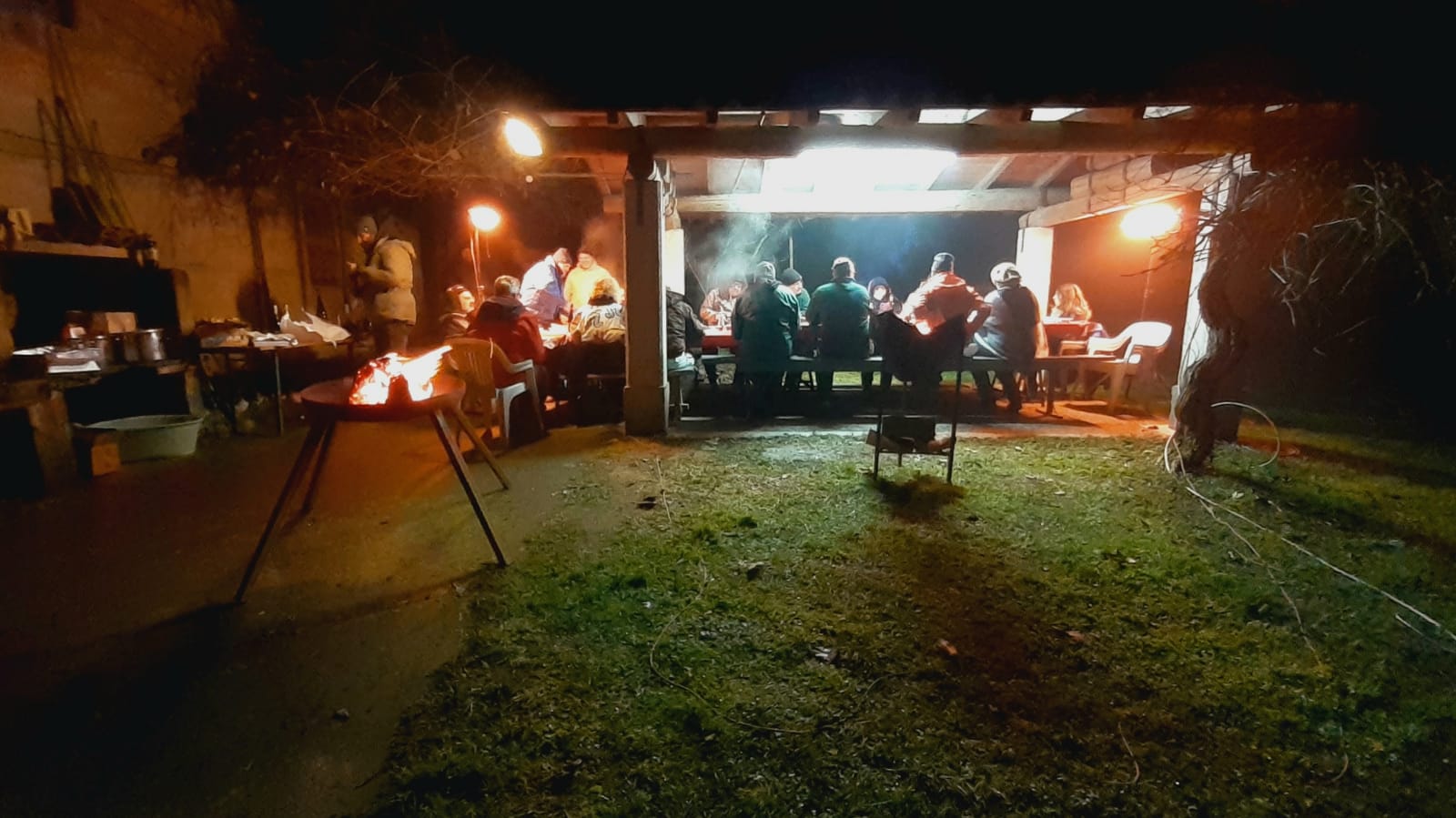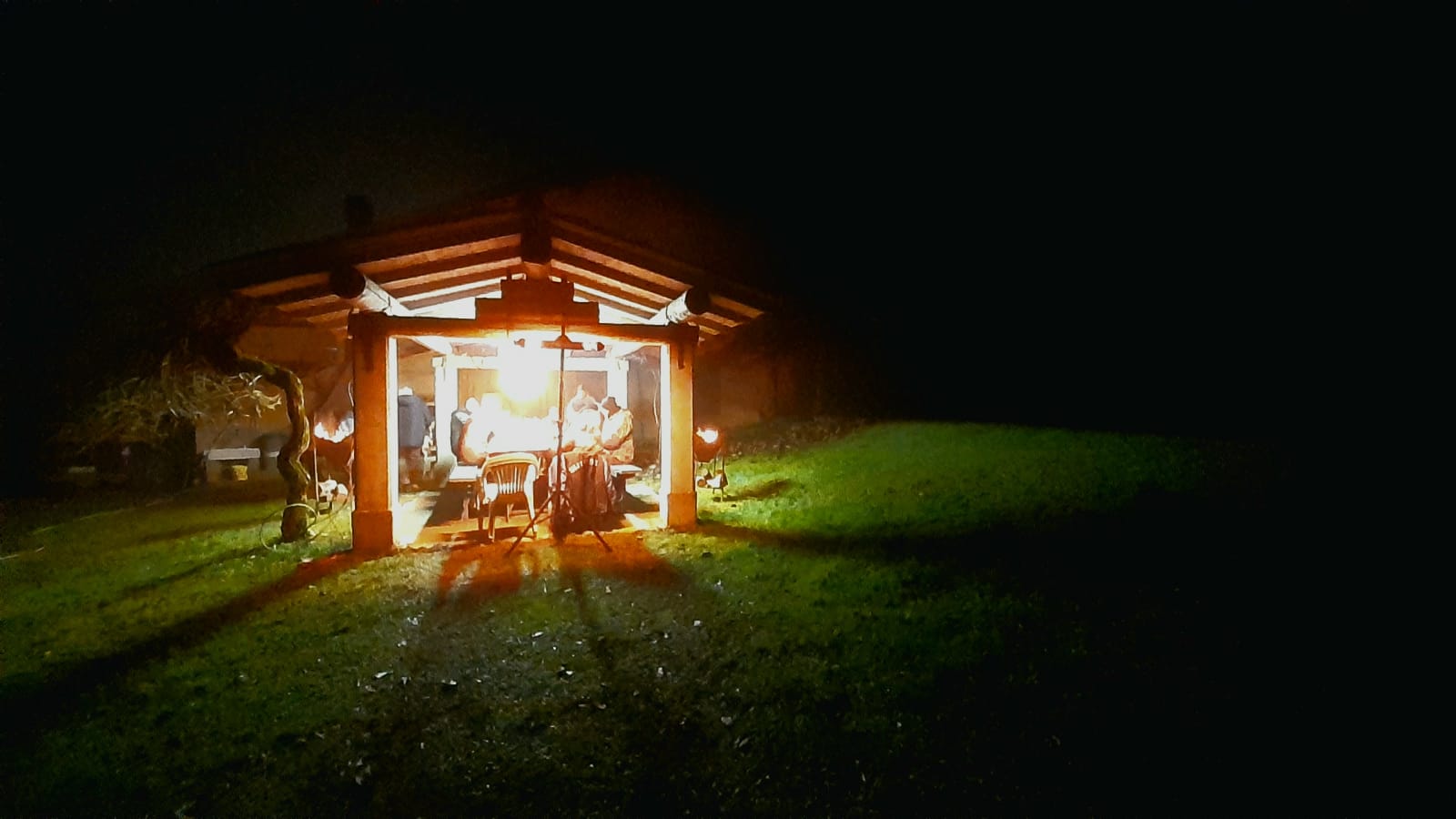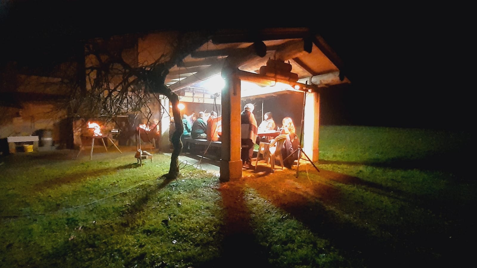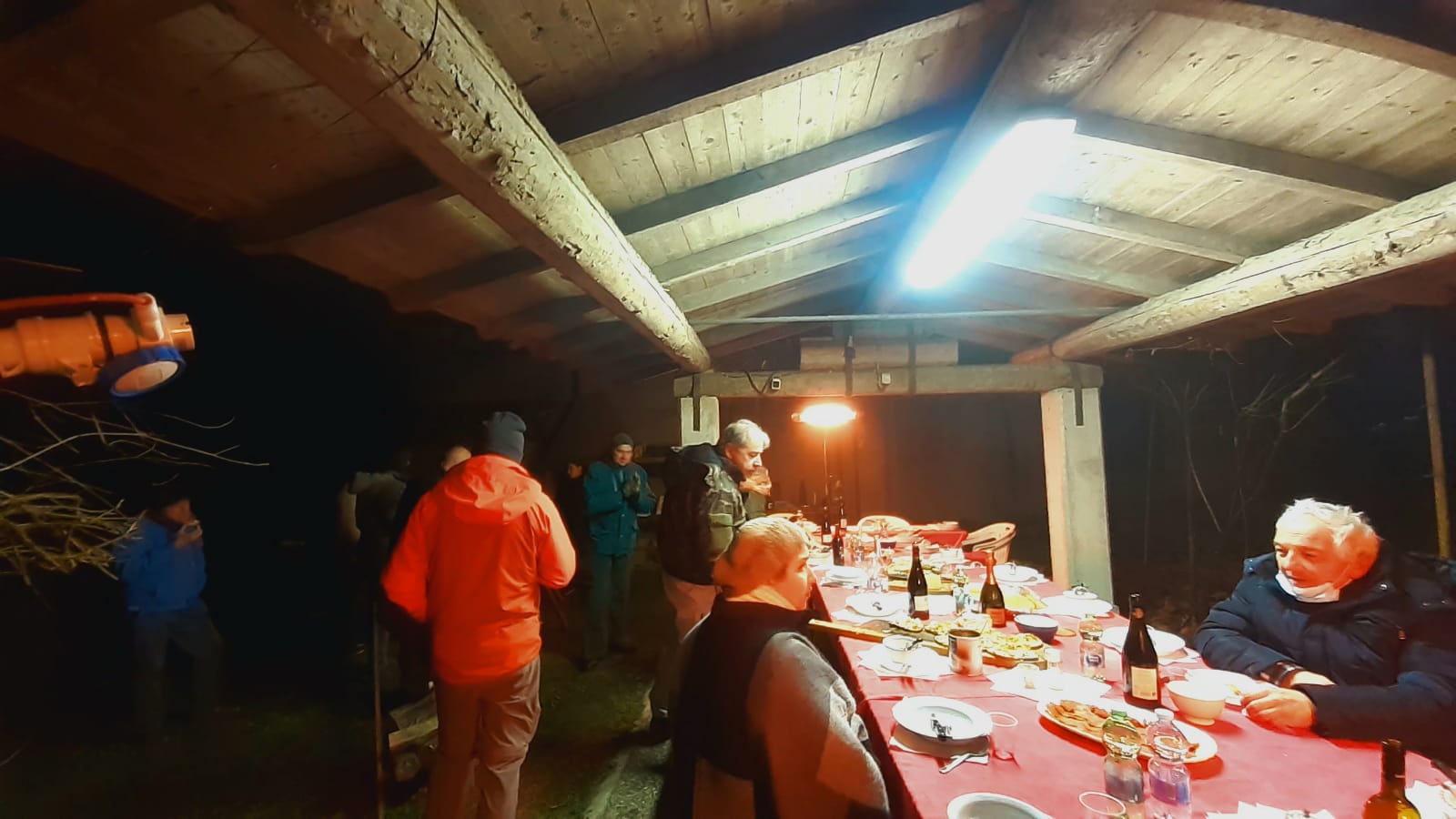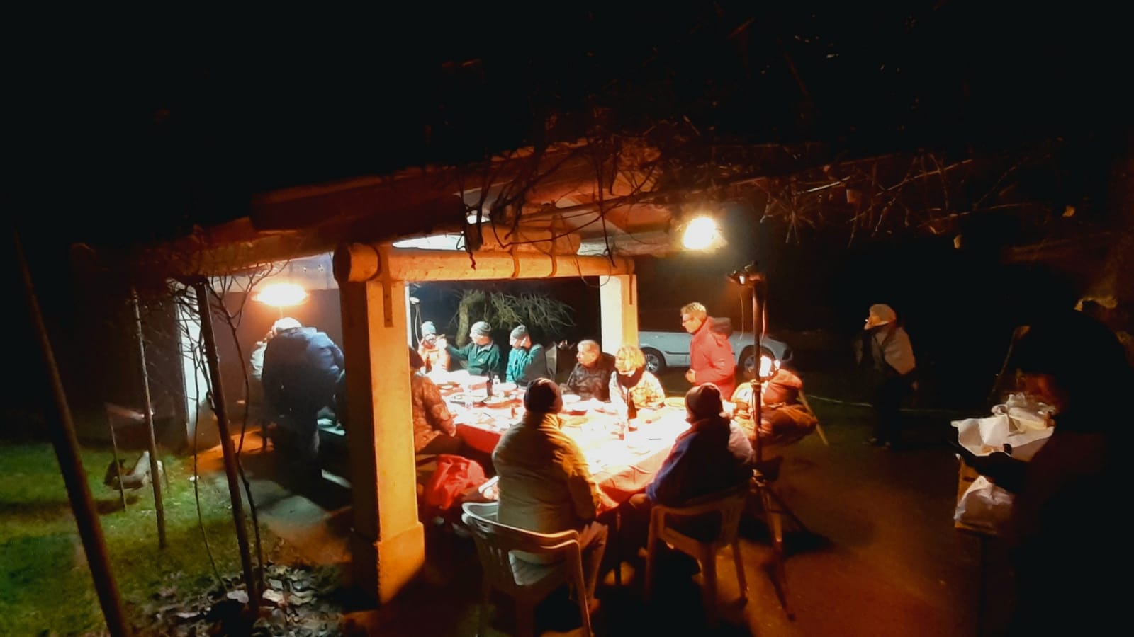 Non ci sono pareti, non ci sono muri e manca qualsiasi forma di riscaldamento che non siano poi le calorie prodotte dalle cibarie ricche di grassi e carboidrati. L’artefice di tutto ciò è l’ex proprietario dell’Acquario Vitaliano Daolio, a cui si aggregano amici e conoscenti dalla provincia reggiana e parmense. L’occasione è la celebrazione del solstizio (20/21 dicembre) quest’anno anticipato di qualche giorno per impegni assunti. Ognuno dei commensali porta qualcosa dalla propria abitazione, creando cosi un miscuglio di gusti e sapori provenienti dalla cultura gastronomica di ciascuno.