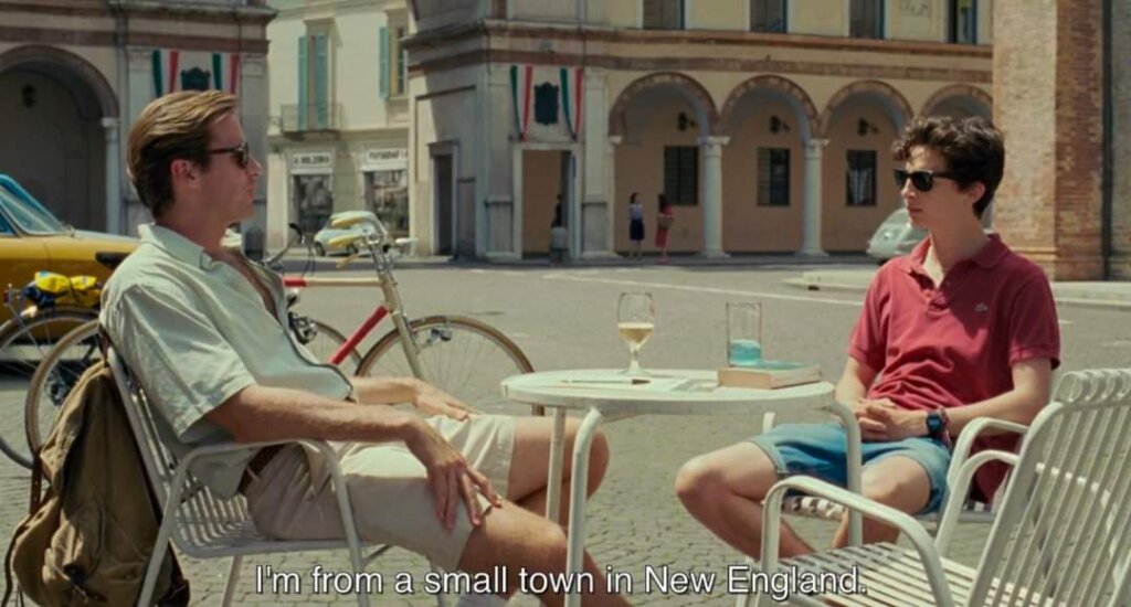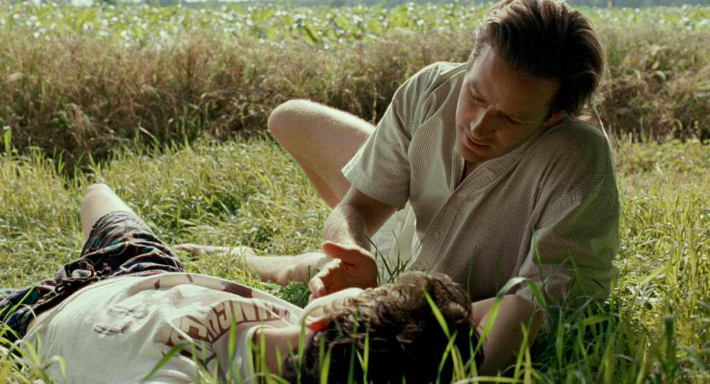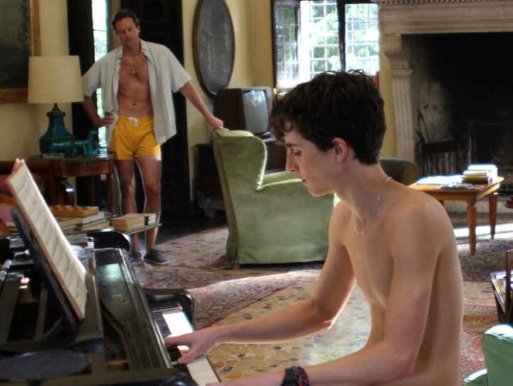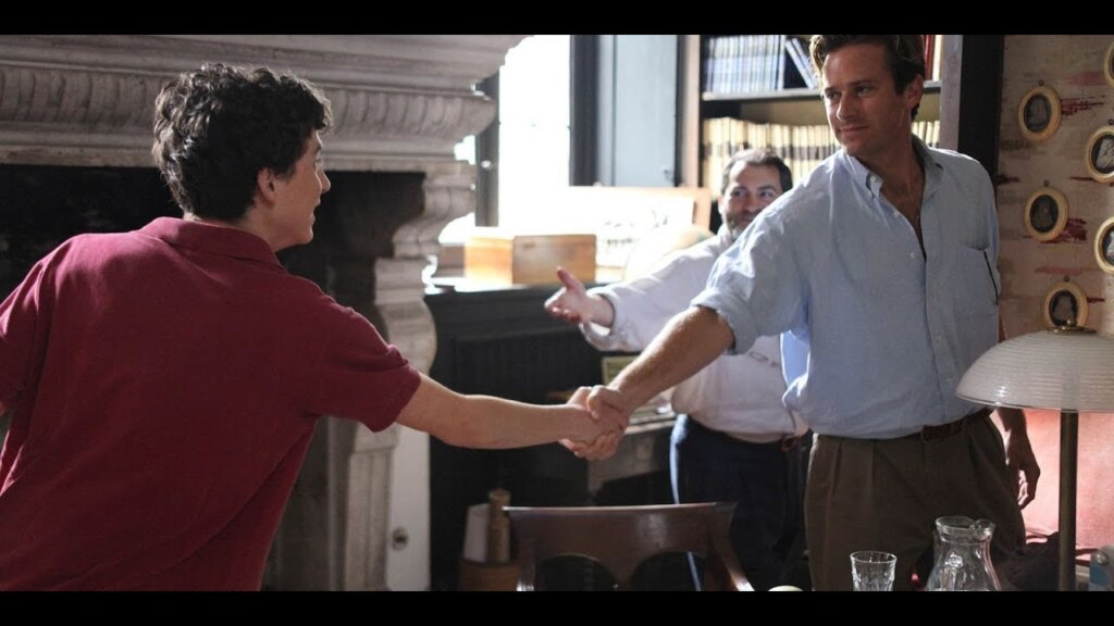 … Somewhere in Northem Italy…. Estate 1983, Moscazzano, Villa Albergoni, Oliver appena giunto dagli USA, stringe per la prima volta la mano a Elio, giovane pianista, coltissimo, anch’egli di origine ebraica. Si ha l’impressione che da quella stretta di mano, da quel primo contatto il fluido dell’uno inizi a mescolarsi con quello dell’altro dando vita a una immediata ammirazione reciproca che si tradurrà in un gioco di intesa mentale, timido corteggiamento e irrefrenabile desiderio. L’amore tra i due nasce, cresce e si consuma tra gite in bicicletta nella campagna della bassa tra Crema, Cremona e Pandino, bagni nel fiume e nelle sorgive, baci rubati sull’erba, gelati e caffè in centro a Crema. Nella placida calma dell’assolato paesaggio agreste padano, nei suoi ritmi lenti, oziosi e assonnati, l’amore di Elio per Oliver aumenta e si intensifica con la stessa forza e lentezza dei ritmi afosi dell’astate, tra tempeste interiori ridondanti e dichiarazioni implicite, tanto che Oliver ne assorbe tutta la potenza e ne viene a sua volta travolto. La natura, per noi che ci siamo nati spesso scontata, diventa un Cupido inarrestabile e dispettoso che arreca ai due giovani emozioni che porteranno dentro per tutta la vita.