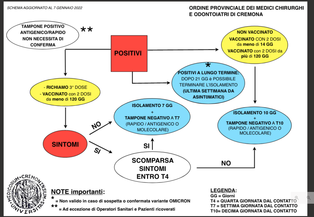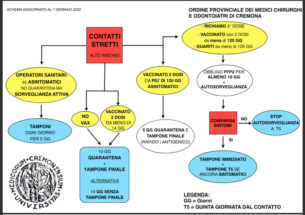 L’Ordine dei Medici Chirurghi e Odontoiatri di Cremona ha redatto due diagrammi di flusso in relazione al Covid-19 rispetto a due condizioni nelle quali possono trovarsi i cittadini: la situazione di contatto stretto (alto rischio di infezione) e la condizione di positività alla SARS-Cov-2. “L’obiettivo è quello di offrire, tramite i giornali e le televisioni locali, un’informazione di facile accesso, semplice ma esaustiva, con l’assicurazione di un continuo aggiornamento. Certamente l’informazione dovrà essere capillare e “ripetitiva” per raggiungere l’obiettivo prefisso a favore delle persone assistite”.