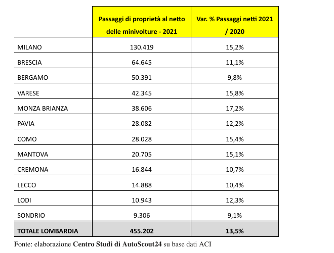 Qual è l’andamento dei passaggi di proprietà a livello territoriale? Nel 2021, la classifica delle province per numero di passaggi di proprietà vede in testa Milano con 130.419 (+15,2% sul 2020), seguita da Brescia con 64.645 (+11,1%), Bergamo con 50.391 (+9,8%), Varese con 42.345 (+15,8%), Monza Brianza con 38.606 (+17,2%), Pavia con 28.082 (+12,2%), Como con 28.028 (+15,4%), Mantova con 20.705 (+15,1%), Cremona con 16.844 (+10,7%), Lecco con 14.888 (+10,4%), Lodi con 10.943 (+12,3%), Sondrio con 9.306 (+9,1%).