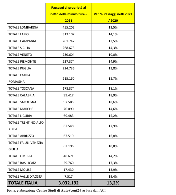 Dopo aver chiuso il 2021 con il segno positivo, il mercato delle auto usate si conferma il canale preferito in Lombardia. Nella regione lo scorso anno sono stati effettuati ben 455.202 passaggi di proprietà netti di auto usate (fonte ACI), in crescita del +13,5% sul 2020, un dato in linea con la media nazionale (+13,2%). E anche per il 2022 arrivano segnali positivi, con l’usato che avrà un ruolo di primo piano.