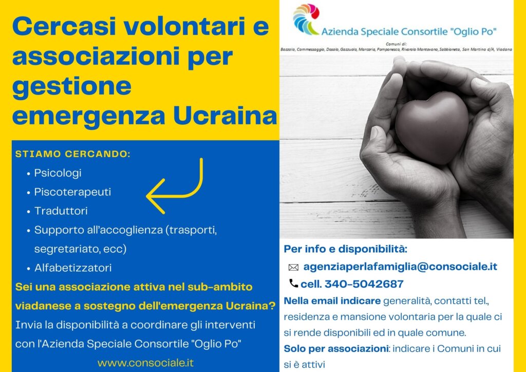 Sono già decine le donne e i minori arrivati nei dieci Comuni consorziati all’Azienda Speciale Consortile Oglio Po (ASC Oglio Po), dove ora più che mai è urgente avere la disponibilità di figure volontarie in grado di rispondere in modo agile e coordinato alle esigenze dei profughi.