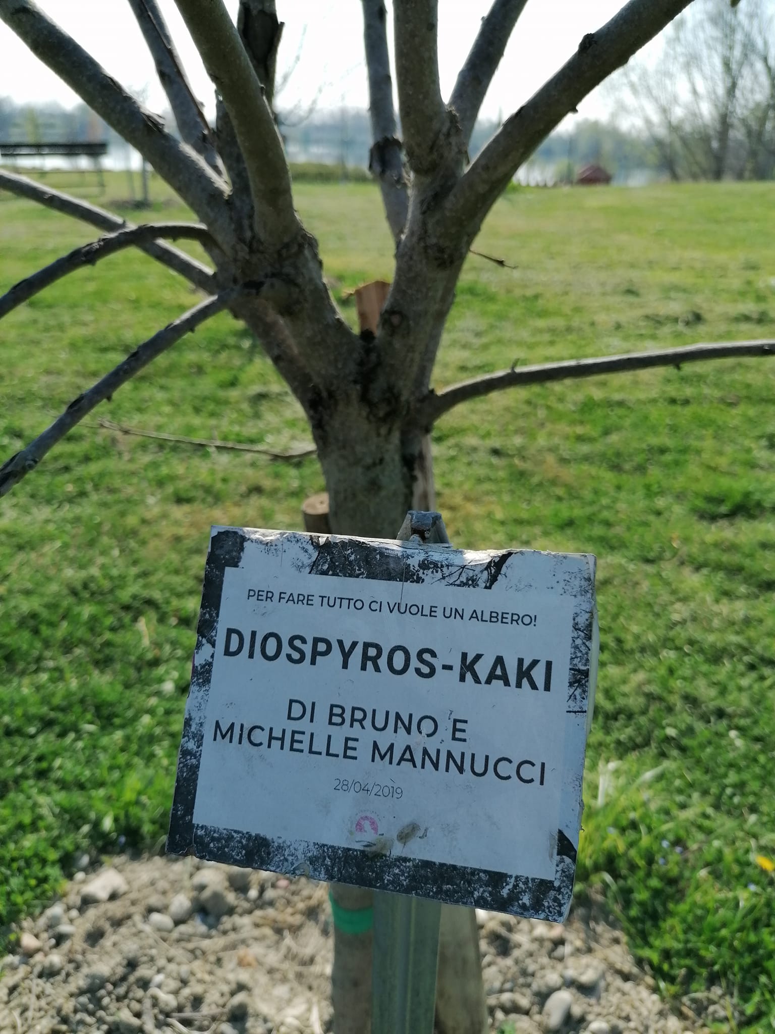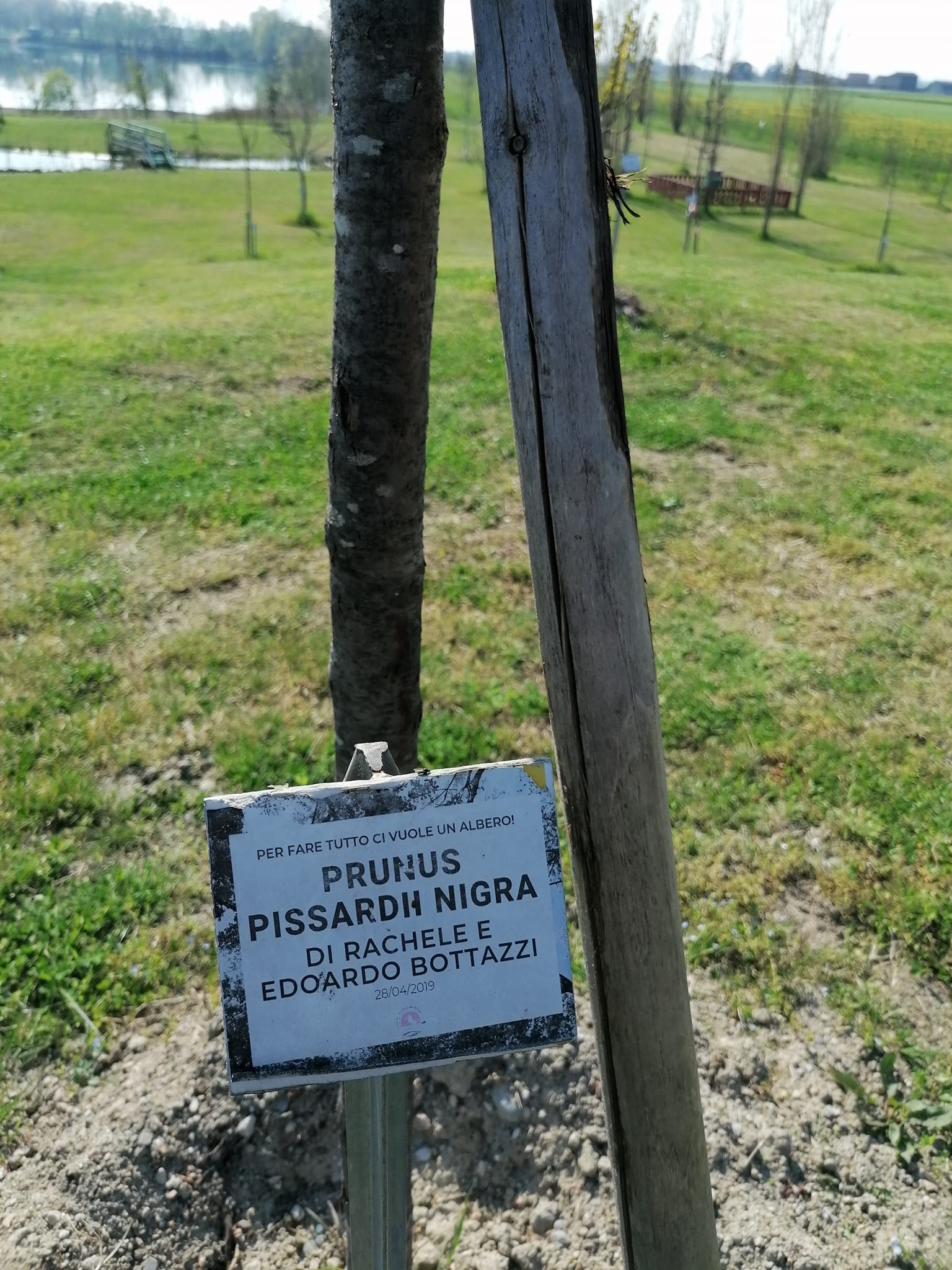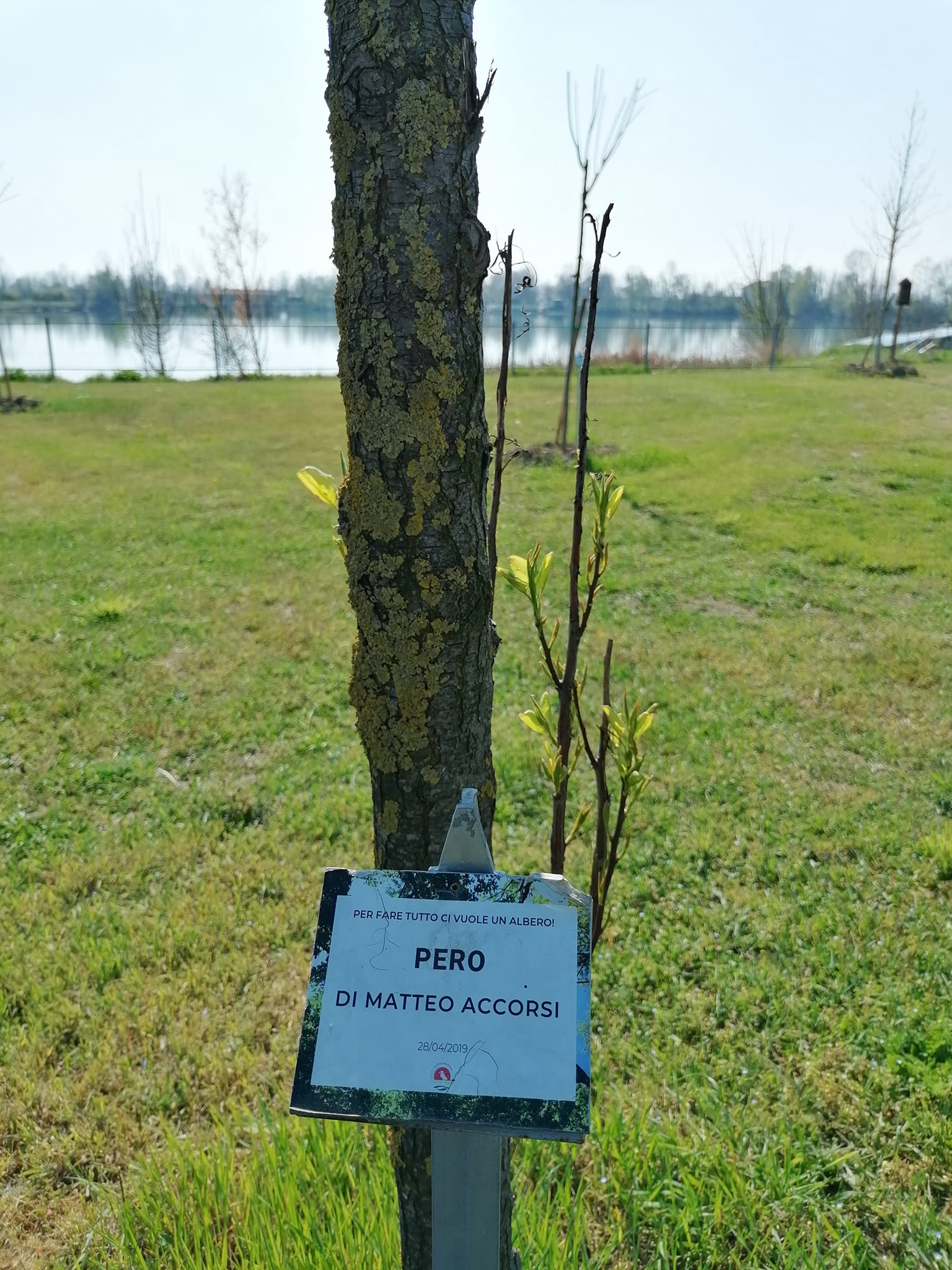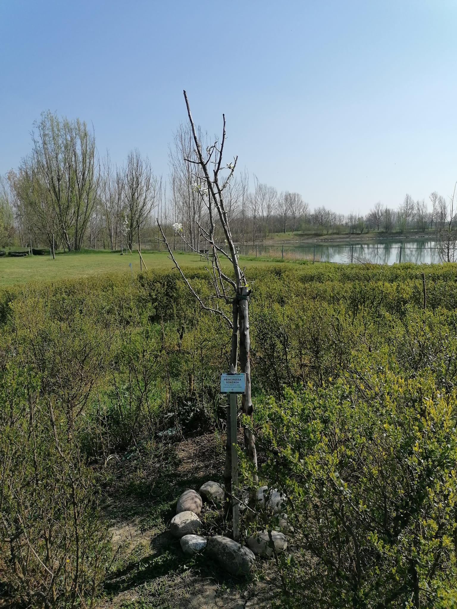 La cosa che mi ha spinto a visitare il parco, tuttavia, è stata la presenza di un raro esemplare di pero, dell’antica varietà Principessa Gonzaga: e, come amante delle pere, mi ha fatto davvero piacere che la piantina, clonata da un patriarca purtroppo scomparso, campeggi al centro del labirinto, una sorta di premio per chi riesce a districarsi e a concludere il percorso. Ma la sorpresa più bella è stata questa: le piante messe a dimora sulla pittoresca collinetta del parco grazie al progetto “dona un albero”, coi nomi dei loro giovanissimi proprietari in bell’evidenza, sono quasi tutte piante da frutto, con peri, meli, cachi, ciliegi, pruni, albicoccgi e noccioli.