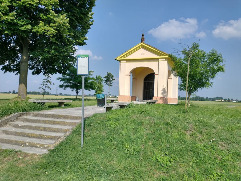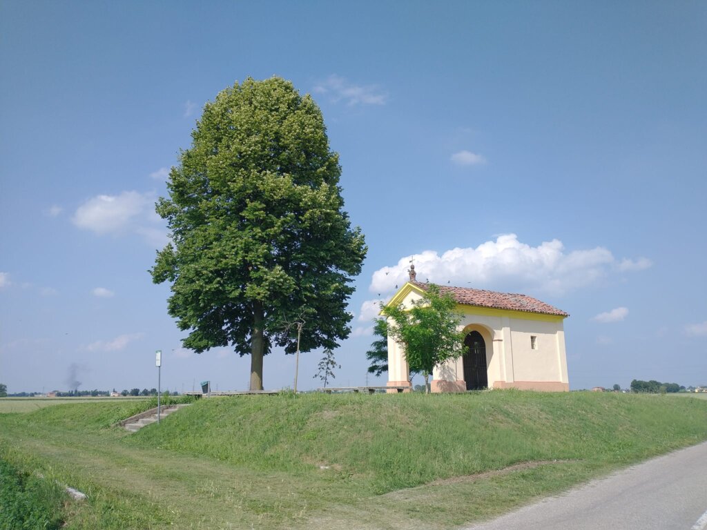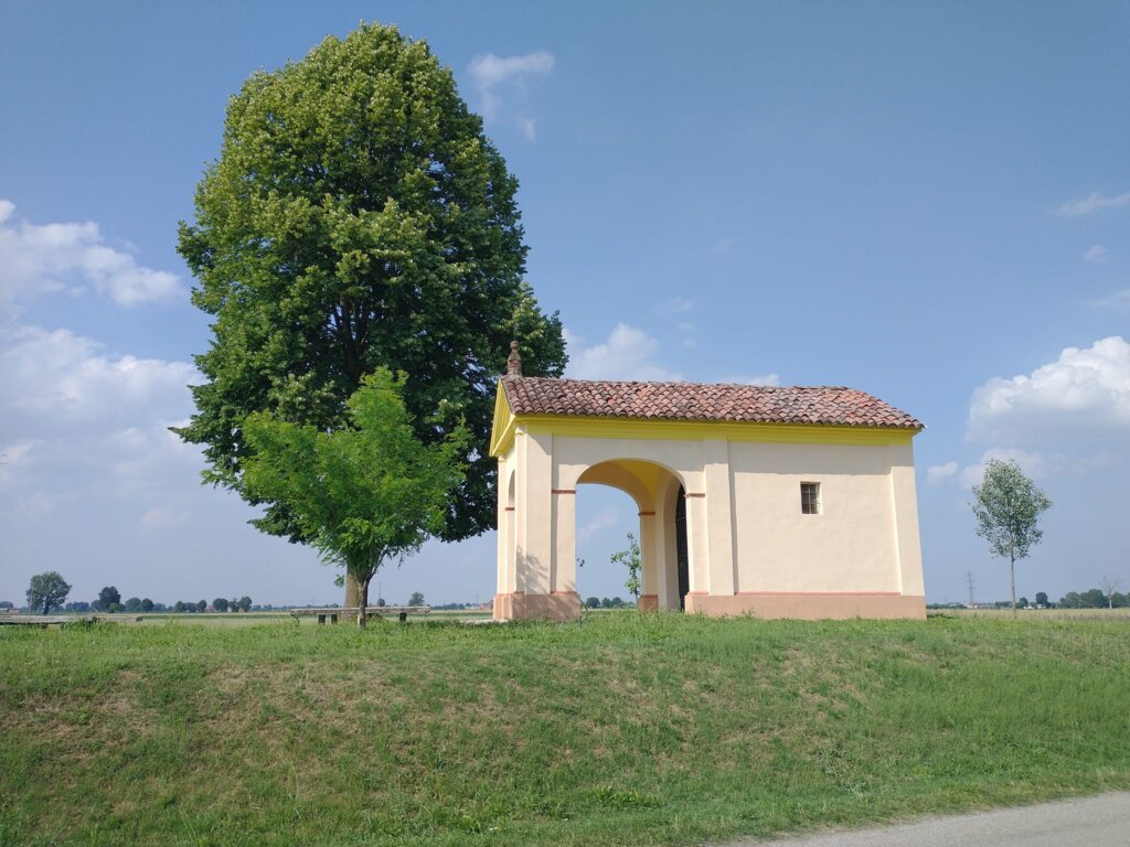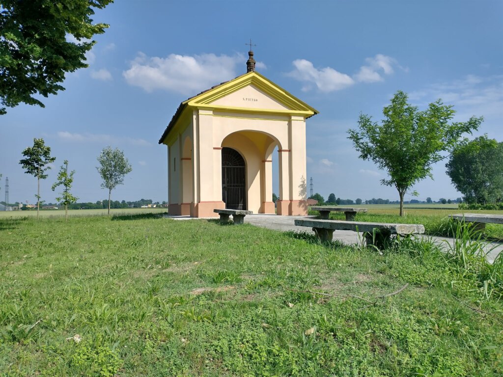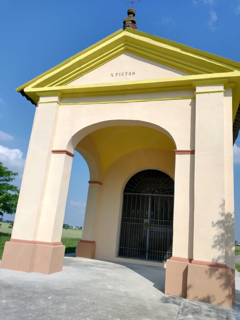 L’edicola di San Pietro è una piccola perla nella bassa. Sita tra Villanova e Rivarolo del Re, sulla bassa che unisce i due centri (il primo frazione del secondo) spicca perché si vede bene percorrendo la strada. In posizione leggermente elevata rispetto al piano della campagna, un tempo era circondata da alberi ombrosi che ne facevano meta per persone in cerca di raccoglimento o di un attimo di riposo prima di riprendere il camino. Negli anni la parte intorno è stata modificata, mantenendone però inalterata poesia e bellezza. Ad occuparsene (come spesso accade e ancor più spesso in aree lontane dalle rotte più battute) un comitato che ci tiene molto, ed ha molta cura dell’edicola. Non è una costruzione antichissima (è del XVIII secolo) ma è un luogo del cuore, uno di quelli che chi abita nella bassa ed è innamorato della campagna si porta addosso, e dentro.