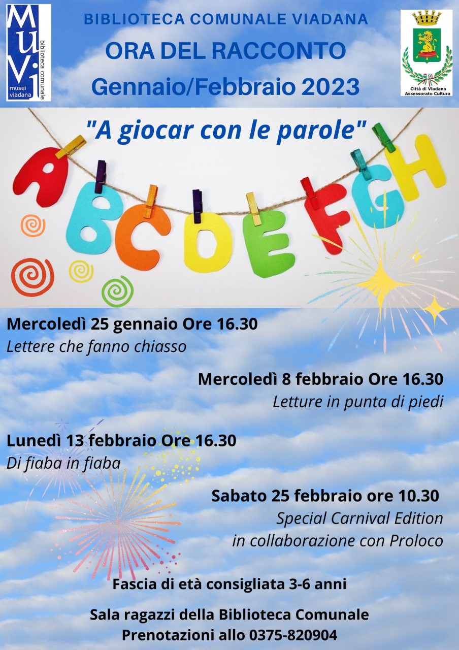 Il tema degli incontri, questa volta, prende il titolo di “A giocar con le parole”. Si parte mercoledì 25 gennaio alle ore 16.30 con “Lettere che fanno chiasso”. Secondo appuntamento mercoledì 8 febbraio sempre alle ore 16.30 con “Letture in punta di piedi”. Terzo appuntamento lunedì 13 febbraio alle ore 16.30 con “Di fiaba in fiaba”. Quarto e ultimo appuntamento sabato 25 febbraio alle ore 10.30 con la “special carnival edition” in collaborazione con la Pro loco.