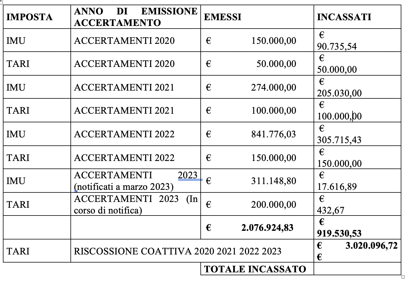 Nel dettaglio: a fine 2020 sono stati emessi accertamenti IMU per € 150.000,00 e incassati per € 90.735,54; emessi € 274.000,00 e incassati € 204.000,00; nel 2022 emessi € 841.776,03 e incassati alla data odierna € 302.191,77; nei primi mesi del 2023 sono già stati emessi e notificati avvisi accertamento per € 311.148,80.