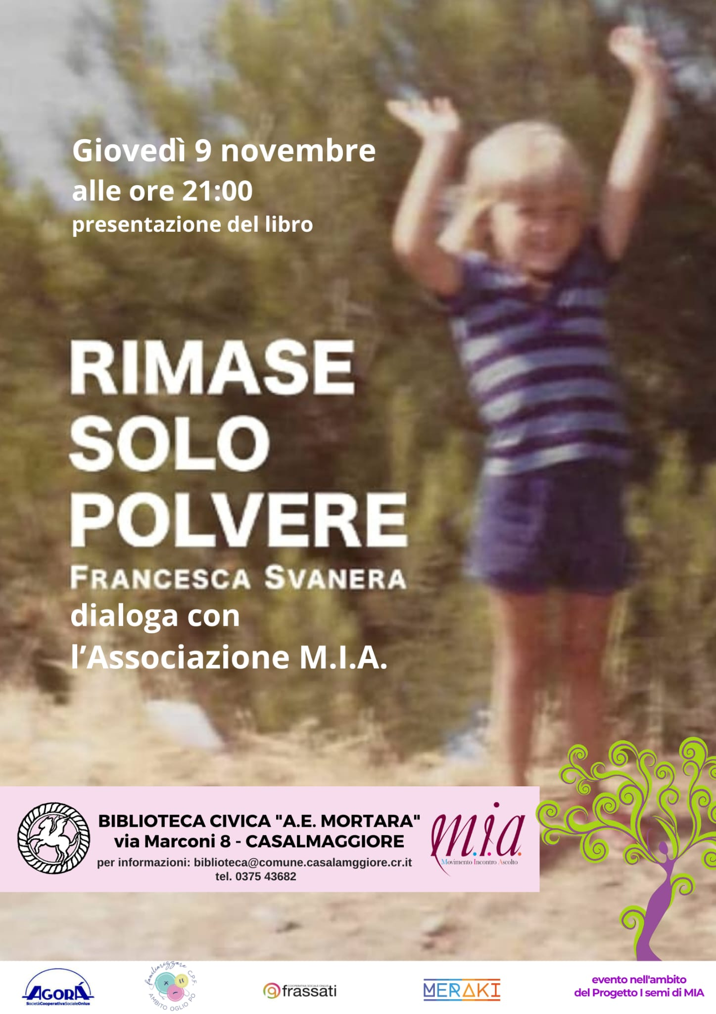 L’appuntamento sarà per questa sera, giovedì 9 novembre alle 21 presso la Biblioteca Civica e verrà ospitata Francesca Svanera, autrice del libro Rimase solo polvere. Sarà il primo evento dal vivo in Biblioteca dopo il periodo pandemico, una tappa importante che costella i numerosi eventi promossi dall’associazione, soprattutto in questo anno che segna il 10* anniversario dalla nascita di MIA.