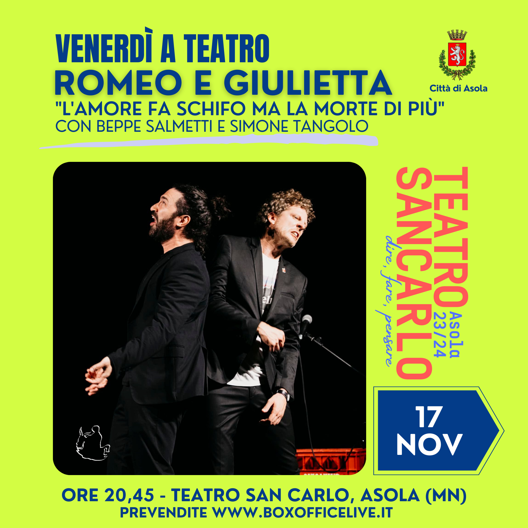 Il prossimo 17 novembre si alza il sipario sulla nuova rassegna teatrale asolana 2023/2024 a cura di Ippogrifo Produzioni in collaborazione con il Comune di Asola presso il Cinema San Carlo, con “L’amore fa schifo ma la morte di più”, il dramma shakespeariano nella personalissima reinterpretazione di Impermeabili, duo composto dagli inossidabili Beppe Salmetti e Simone Tangolo. Un dramma che diventa commedia. Uno spettacolo brillante: cantato, ballato, recitato. La storia, drammatica, di Romeo e Giulietta, diventa argomento quotidiano in cui tutti si possono riconoscere. Scoprendo così il “vero” protagonista della tragedia: Paride. Il principe promesso a Giulietta, che lei snobba, pronta al suicidio pur di non doverlo sposare. L’amore eterno degli innamorati veronesi è allora spunto per le frustrazioni di tutti. Frustrazioni sulle quali sorridere e cantare insieme.