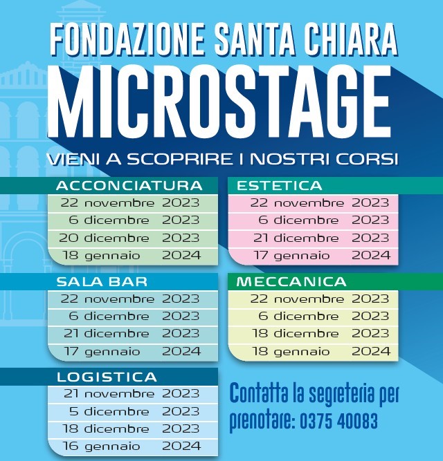A completare le proposte per l’orientamento ci sono i microstage: tramite prenotazione (mail a s.didattica@fondazione-santachiara.it) è possibile frequentare per una mattina il laboratorio scelto durante le lezioni, in modo da vedere dal vivo come funzionano le lezioni della materia professionale e sperimentare in prima persona (i futuri allievi sono direttamente coinvolti nelle attività) l’attività della professione che si è scelta.