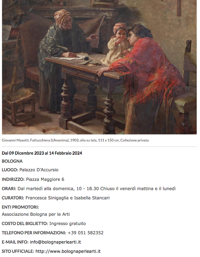 L’Associazione Bologna per le Arti presenta a Palazzo d’Accursio dal 9 dicembre al 4 febbraio, Giovanni Masotti (1873-1915). Turbamento ed estasi, una mostra curata da Francesca Sinigaglia e Isabella Stancari che si propone di ricostruire la vita e l’operato del pittore, celebrando i 150 anni dalla nascita e redigendo, per la prima volta, un catalogo delle opere conosciute.