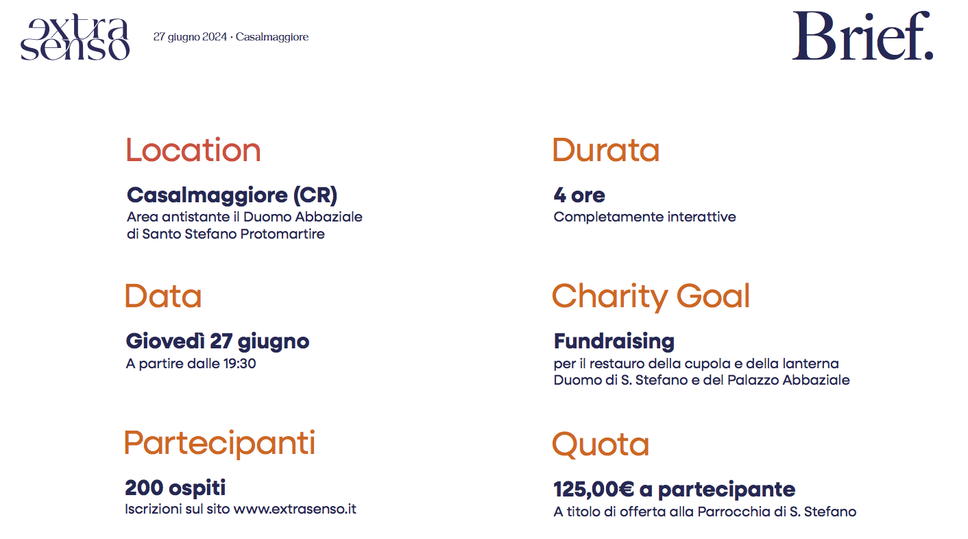 Donazioni (erogazioni liberali) – È possibile effettuare una donazione di qualsiasi importo. Ricordiamo che è consentita la detraibilità e la deducibilità delle suddette erogazioni liberali effettuate in favore della Parrocchia di S. Stefano Protomartire per la realizzazione dei lavori di restauro da persone fisiche, imprese ed enti non commerciali. Entro 30 giorni dalla ricezione dell’erogazione liberale, la Parrocchia procederà a trasmettere al donante opportuna ricevuta contenente il dettaglio della somma donata. Per info su IBAN e causale, scrivere a: donazioni@extrasenso.it Biglietti per la serata Le quote di partecipazione all’evento sono da intendersi come Offerte alla Parrocchia di S. Stefano Protomartire di Casalmaggiore (Ente Ecclesiastico civilmente riconosciuto con D.M. n. 239 del 14.10.1986 pubblicato in G.U.) e, pertanto, non sono soggette ad IVA. È inoltre possibile ricevere regolare ricevuta, facendone richiesta successivamente al pagamento. Le offerte saranno raccolte dalla società filRouge s.r.l. in nome e per conto della Parrocchia e su mandato della medesima. Per prenotare il proprio posto alla serata, è possibile procedere direttamente dal sito www.extrasenso.it
