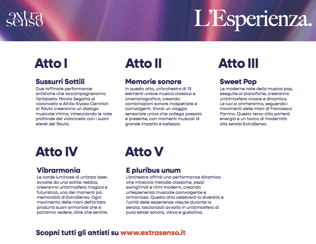 ExtraSenso si divide in 5 atti durante i quali l’illuminazione scenografica, le performance di oltre 15 artisti, la cena gourmet di quattro portate e una pièce finale di altissimo livello, trasformeranno la piazza in una vera e propria opera d’arte della quale gli ospiti saranno i protagonisti.