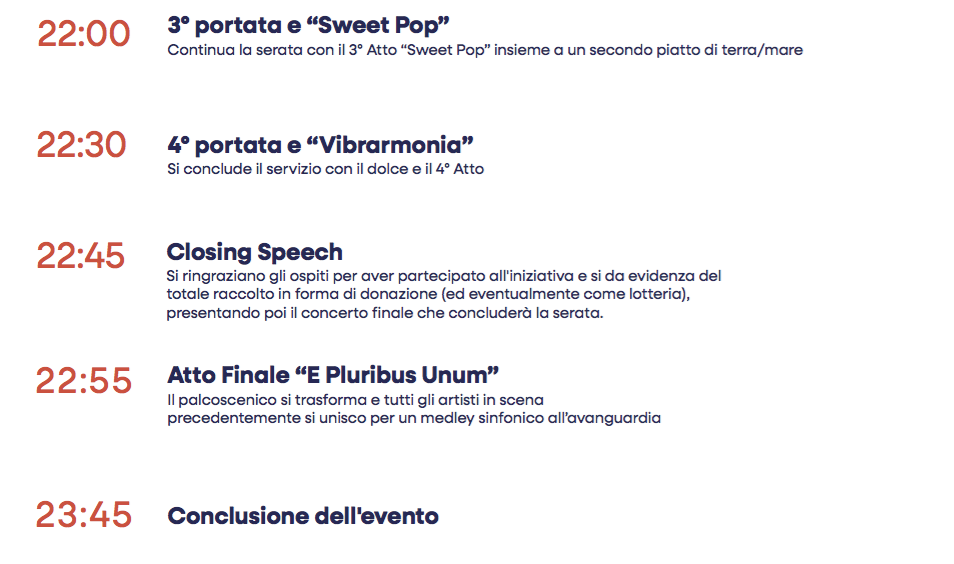 Mangiare con gli occhi e con le orecchie – Il menù sarà curato da un rinomato chef locale, con piatti che riflettono la tradizione culinaria del territorio con un tocco di innovazione. Ogni portata sarà accompagnata da vini selezionati. Il servizio sarà attento ma discreto, per non distogliere l’attenzione dalla musica e dallo spettacolo. Tra una portata e l’altra, è previsto intrattenimento musicale e artistico che accompagnerà il servizio. Anche l’illuminazione asseconderà le scelte culinarie dello chef e la mise en place, creando un’esperienza immersiva.