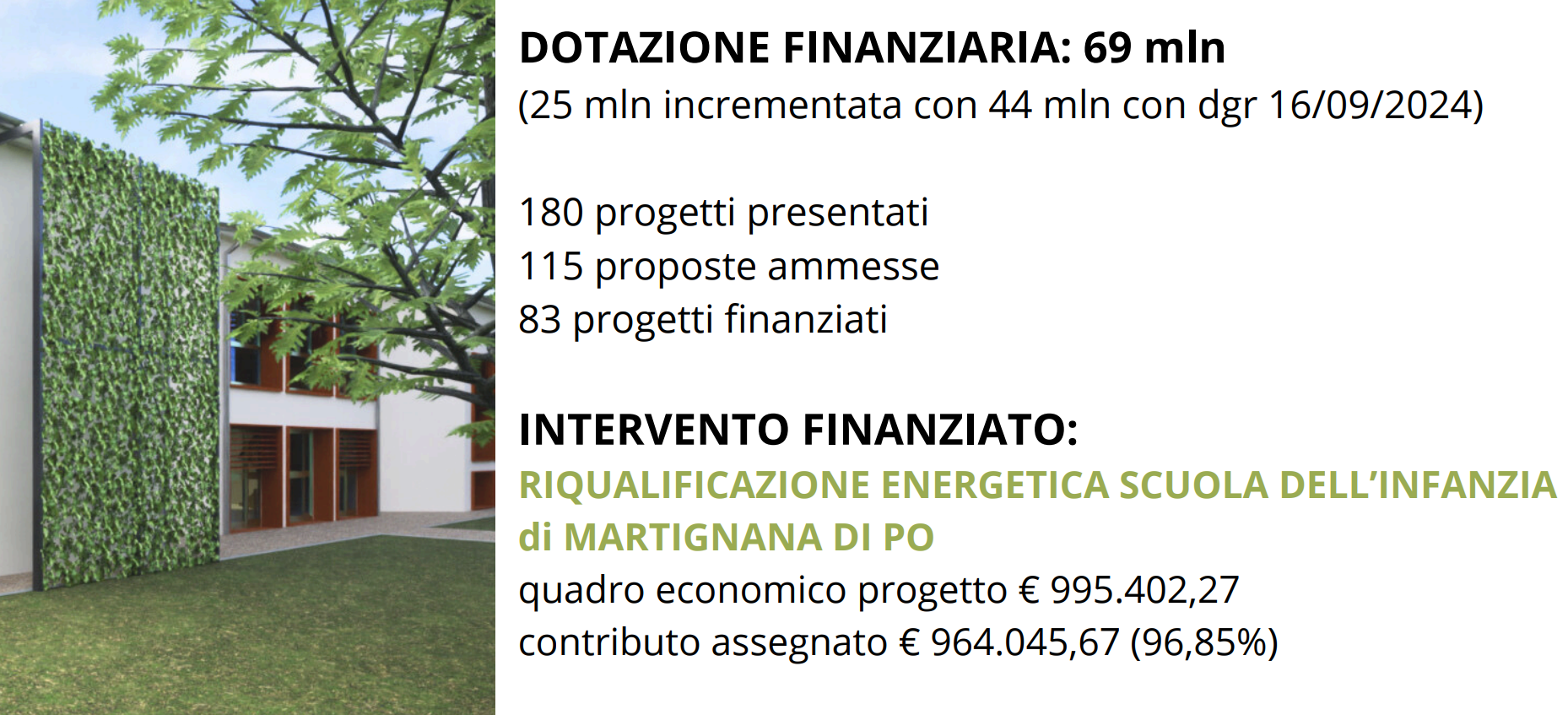 Un lavoro di squadra: il comune di Martignana di Po, StudioRinnova che ha curato il progetto e infine Abstract, l’ufficio bandi di Casalmaggiore che è riuscito a centrare il risultato: un progetto da 900mila euro per riqualificare il plesso della scuola dell’Infanzia martignanese, con una copertura che, proprio grazie al bando Recap, sfiora il 97%.