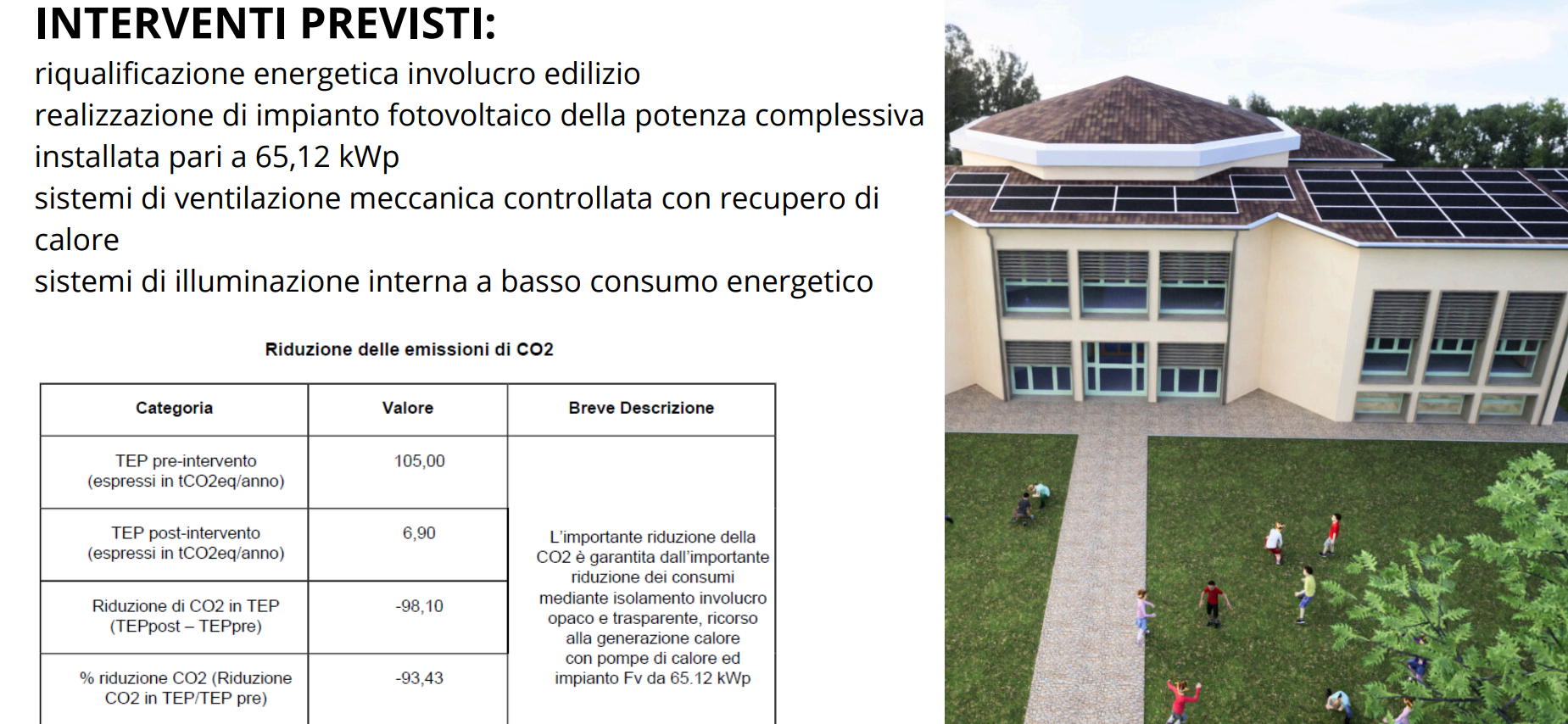 Chiarini, dal canto suo, ha spiegato come il nuovo plesso, dopo i lavori che dovrebbero essere eseguiti entro novembre 2025 (ma è prevista una proroga), consumerà un decimo di quanto consuma oggi. Pompa di valore, fotovoltaico da 65 Kwatt e altri accorgimenti creeranno un edificio a consumo, come si suol dire, quasi zero. E’ prevista una domotica light con il controllo dell’illuminazione e dell’irraggiamento solare, così come piantumazioni nuove.