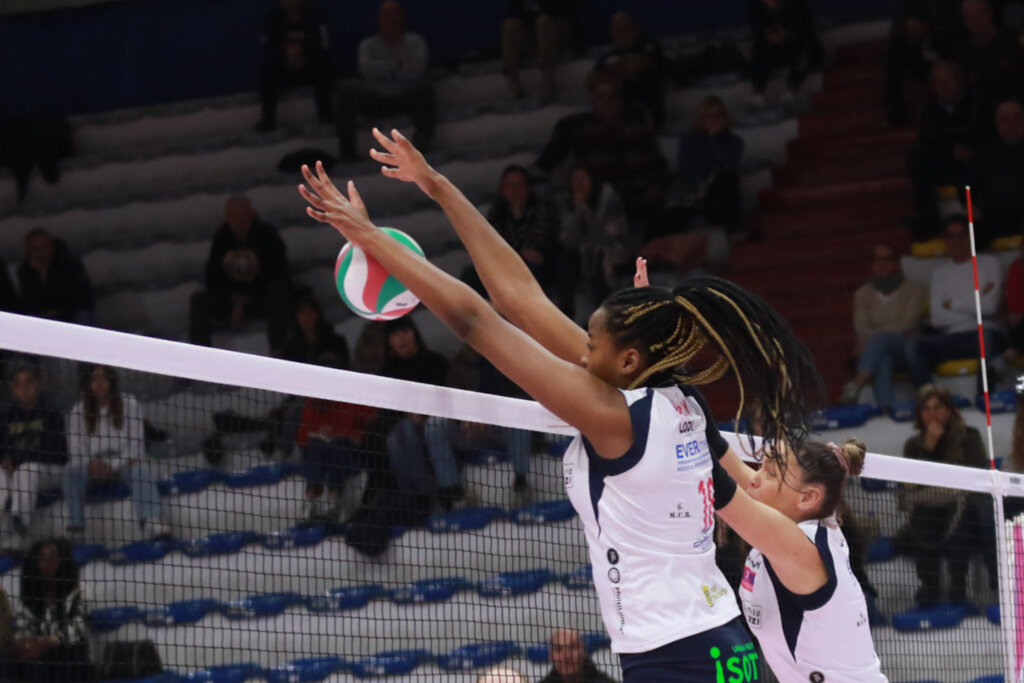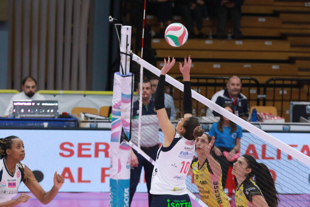 Primo set. Le ospiti aprono le danze in diagonale e allungano con una palla morbida, 2-0, l’errore in attacco delle giallo nere poi regala il primo punto alle rosa, 1-2. Super mani out di Costagli, 2-4. Le ospiti spingono fortissimo, 9-3 time out per coach Napolitano. Si rientra in campo e il mani out di Grbavica è positivo, 4-9. La batta di Meli finisce a rete, 6-11, quella di Grbavica è out, 12-6. Bella diagonale di Costagli che piega le mani del muro e fa 7-12. Palla morbida di Montano che passa sopra il muro, 8-13. Davidovic ci prova ma Nwokoye alza le braccia e non passano neanche le mosche, 10-13. Gran botta di Costagli, palla in tribuna, 11-14. Nwokoye vince un contrasto sotto rete e fa 12-15, Perletti accorcia, 13-15. La battuta di Davidovic esce, 15-20, time out per coach Solforati. Si torna in campo e la palla morbida di Montano mette in difficoltà la difesa ospite, 16-20. Sul 17-23 coach Napolitano inverte la diagonale inserendo Cantoni e Nosella. La battuta di Cantoni è out, palla set per le bresciane, 24-17, Meli mura Nosella, 25-17. Top scorer: Costagli 4, Pistolesi 5