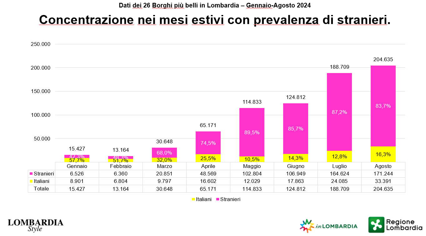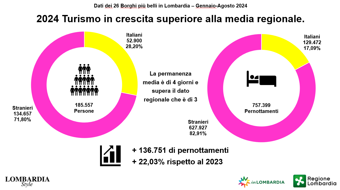 L’Assessore ha poi presentato i dati 2024 del turismo mantovano che confermano la crescita superiore alla media regionale. In particolare, da gennaio ad agosto, sono state registrate 199.229 persone (31,65% stranieri e 68,35% italiani) e 558.634 pernottamenti (83mila in più del 2023, +18,03%). Si delinea una prevalenza di turisti italiani, ma con stranieri in crescita (dal 20,4% di gennaio al 50,9% di agosto).
